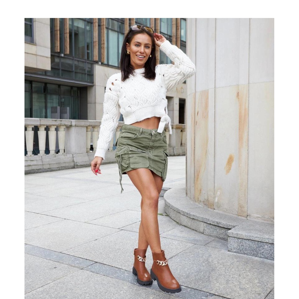Die Stiefel haben eine runde Nase, die Eleganz und Subtilität verleiht. Insbesondere die dekorative Kette, die ein modischer Akzent ist, erregt die Aufmerksamkeit, die sich sicherlich in der Menge abheben wird. Eine stabile, flache Ferse mit einer Höhe von 3,5 cm sorgt für den täglichen Gebrauch und ermöglicht lange Spaziergänge, ohne sich unwohl zu fühlen.