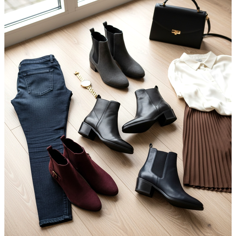 Stiefeletten sind der perfekte Kompromiss zwischen Eleganz und praktischem Komfort. Für Mitarbeiter, die den größten Teil des Tages im Büro verbringen und sich nicht viel bewegen, können Stiefeletten mit 3-5 cm Absatz eine ausgezeichnete Wahl sein. Solche Höhen ermüden nicht und verleihen der Figur gleichzeitig Eleganz und Selbstbewusstsein. Schwarze Stiefeletten sind ein Klassiker, aber es lohnt sich auch, mit Braun, Burgunderrot oder Marineblau zu experimentieren. Denken Sie jedoch daran, die Absatzhöhe nicht zu sehr zu berücksichtigen – Mitarbeiter, die viel laufen, werden dankbar sein, wenn sie sich für Stiefel mit flacher Sohle oder mit niedrigem, bequemem Absatz entscheiden. Stiefeletten sind ein trendiges Modell, das perfekt in moderne Büros passt. Sie können sie zu Jeans (wenn es Business Casual ist), Zigarettenhosen oder eleganten Röcken tragen.