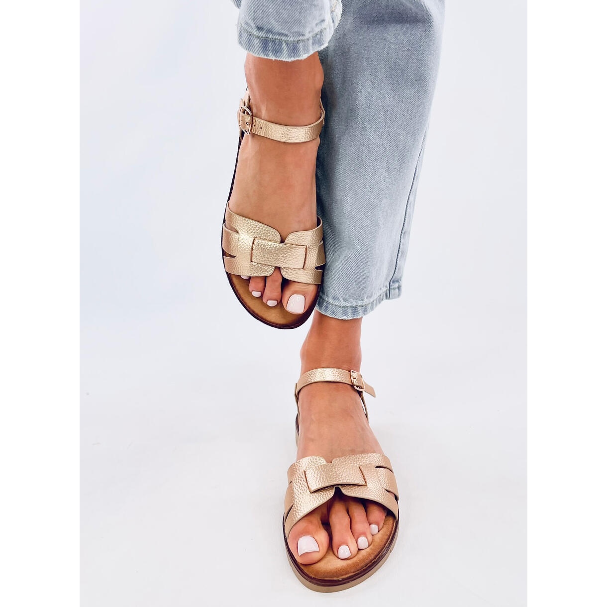 Das Innere der Sandalen ist mit einer weichen Innensohle aus ökologischem Leder ausgestattet, die auch bei langen Spaziergängen Komfort garantiert. Perfekt für Sommertage, ihre metallisch-goldene Farbe verleiht jedem Styling Glanz und durch den klassischen Schnitt passen sie zu verschiedenen Outfits, von legeren bis hin zu eleganten Abendoutfits.