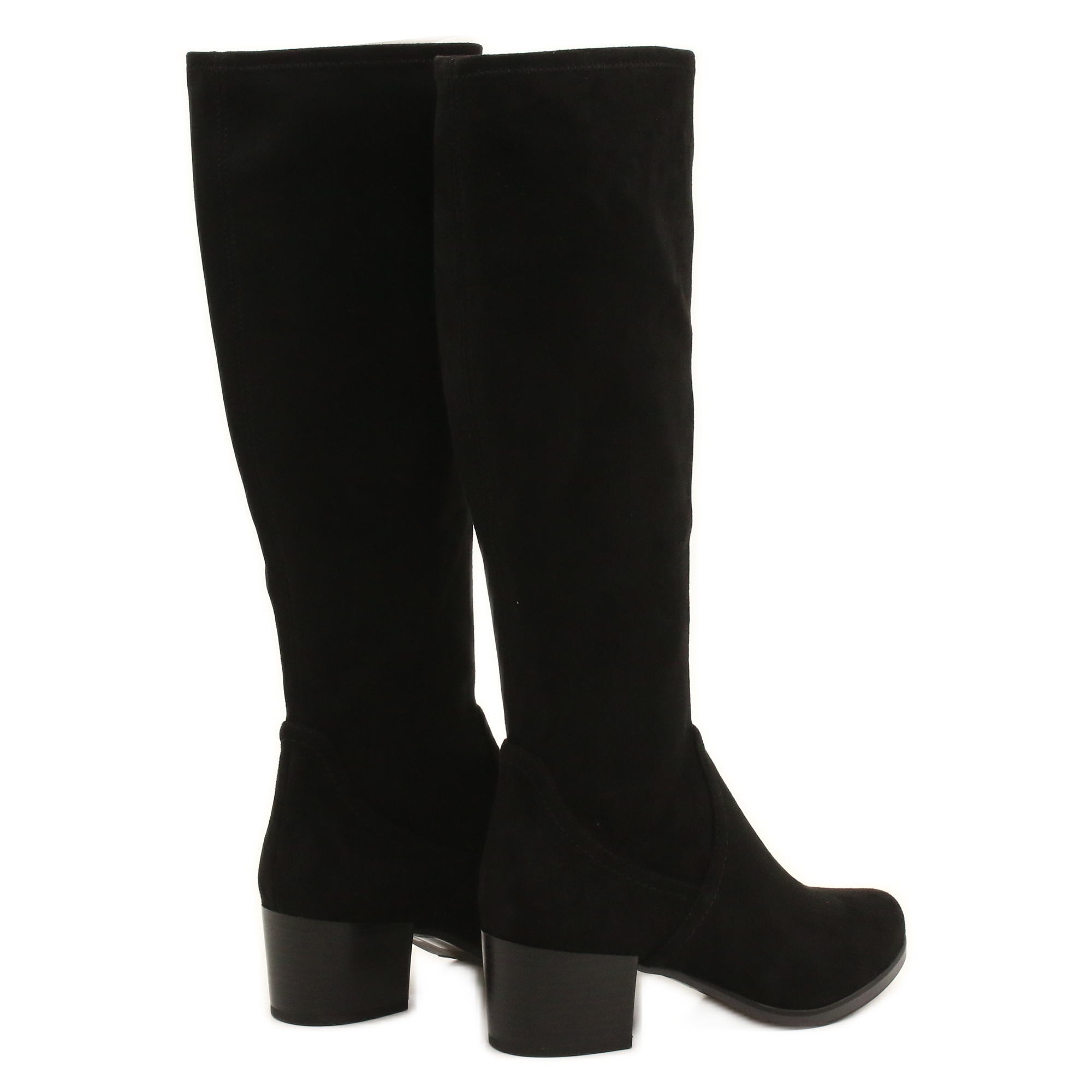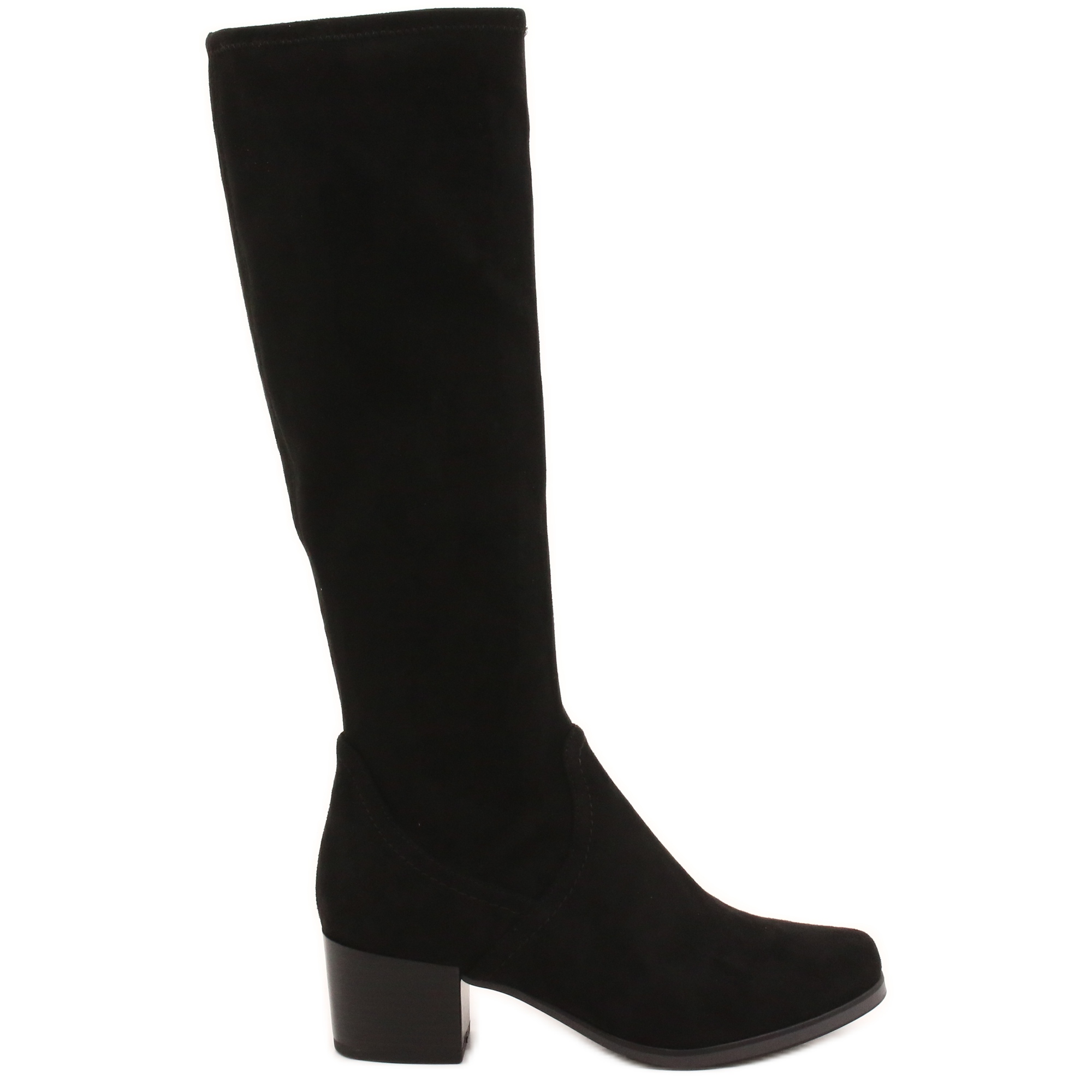 Lange, elegante Leckstiefel aus dichtem, dehnbarem Textilmaterial (Stretch) in einer universellen schwarzen Farbe. Dank des elastischen Stoffes passt sich das Obermaterial gut an das Kalb an, um ein stilvolles Aussehen und ein Komfort des Tragens zu gewährleisten. PFI 100% veganes Modell - ohne tierische Komponenten.