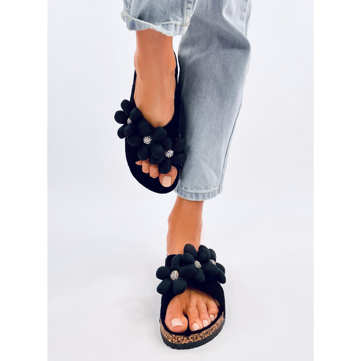 Entdecken Sie Komfort und Stil in einer Sommerabgabe dank Korkenklappen mit Chares Black Flowers. Diese eleganten Hausschuhe für Frauen, die in klassischem Schwarz gehalten werden, sind eine perfekte Kombination aus modischem Design und Funktionalität. Ihre Einzigartigkeit liegt in wunderschönen Blumendekorationen, die zusätzlich mit glänzenden Steinen dekoriert sind, und fügt eine subtile Pracht in jeglicher Stiftung hinzu.