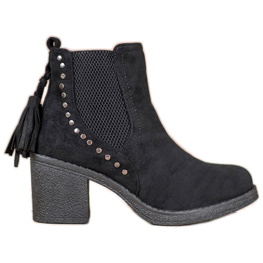Entdecken Sie Eleganz und Komfort mit den Small Swan Chelsea-Stiefeln mit Fransen in klassischem Schwarz. Diese stilvollen Damenstiefel sind das perfekte Accessoire für Herbst und Winter und garantieren nicht nur einen modischen Look, sondern dank eines soliden 7 cm hohen Blockabsatzes auch Tragekomfort.