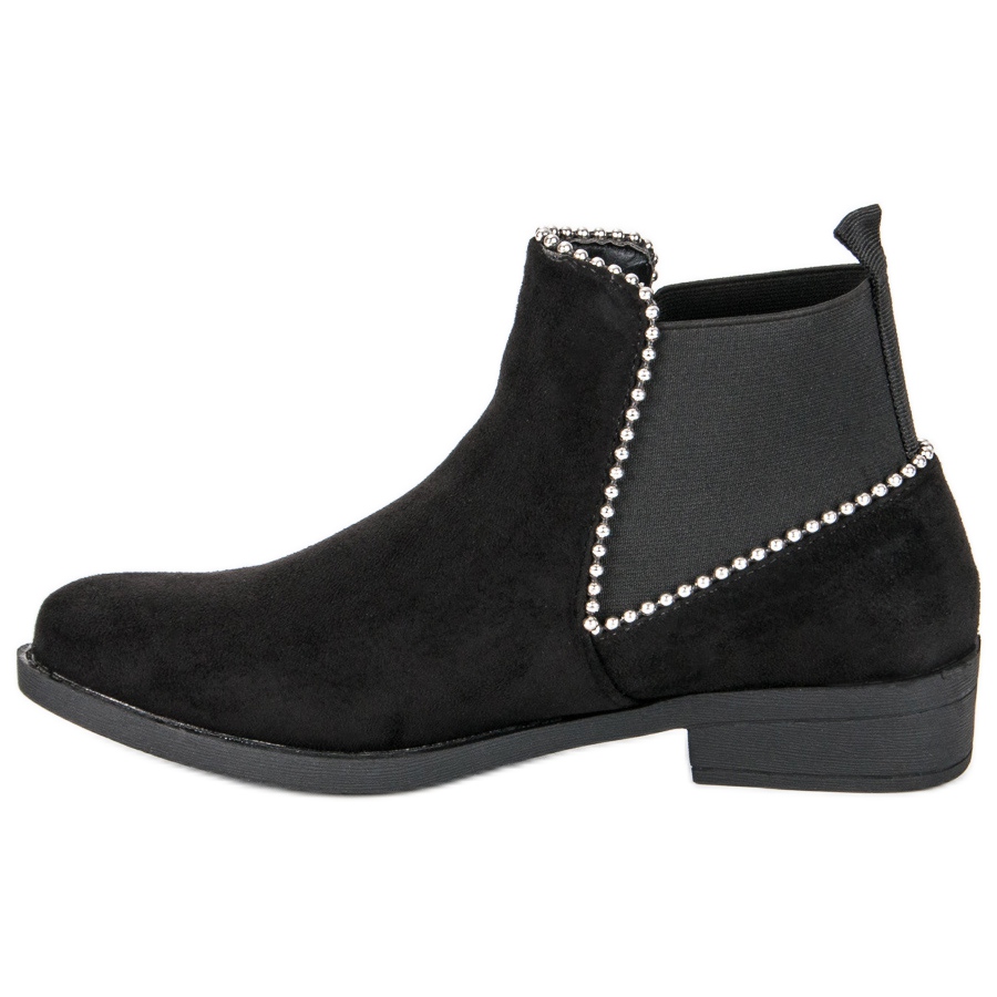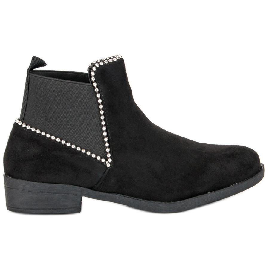 Entdecken Sie die Perfektion eines Klassikers mit unseren schwarzen Chelsea-Stiefeln aus Wildleder, die Komfort mit modischem Design verbinden. Diese eleganten Schuhe mit flacher Sohle, verziert mit zarten Strasssteinen und einem originellen Gummiband hinten, eignen sich sowohl für den Alltag als auch für Abendausflüge.
