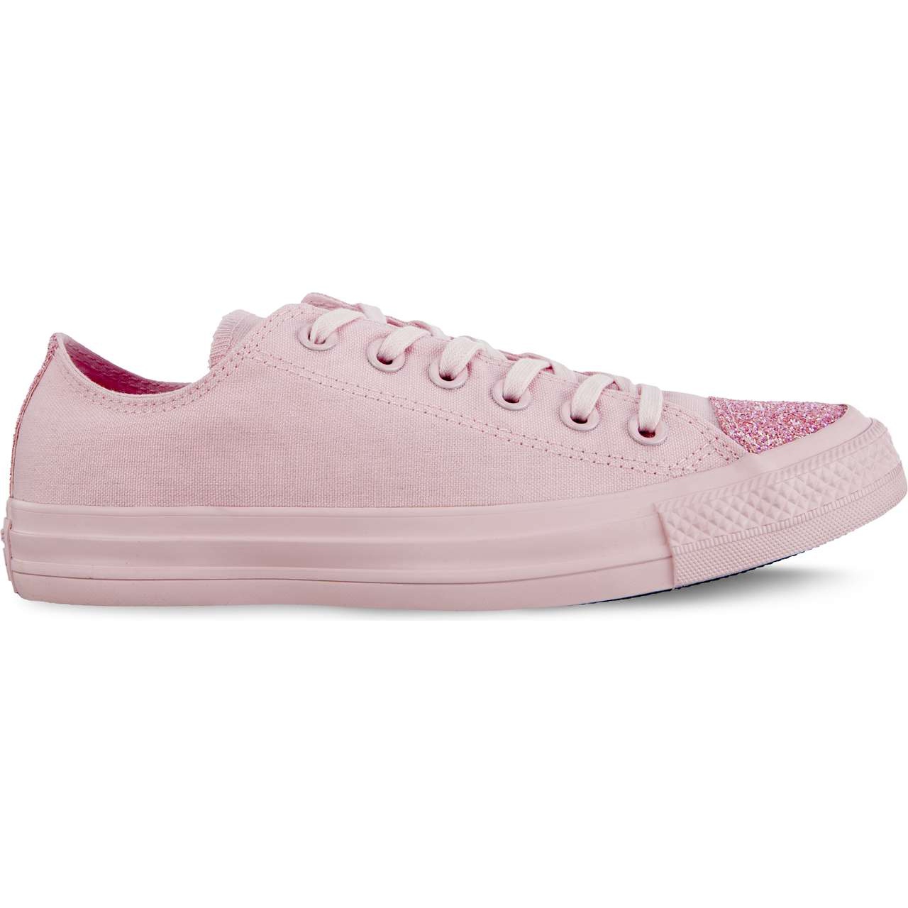 Converse Chuck Taylor All Star C563466 Pink Foam - Leichte Turnschuhe mit einem modischen, femininen Finish. Das obere aus strapazierfähige Stoff in Lila und Pink wurde mit Glitzer auf der Vorderseite und der Ferse dekoriert, was den städtischen Stilisierungen einer effektiven, subtilen Pracht verleiht. Niedrige, geschnürte Schuhe mit rundem Zeh werden sowohl täglich als auch für ungezwungene, modische Sets arbeiten.
