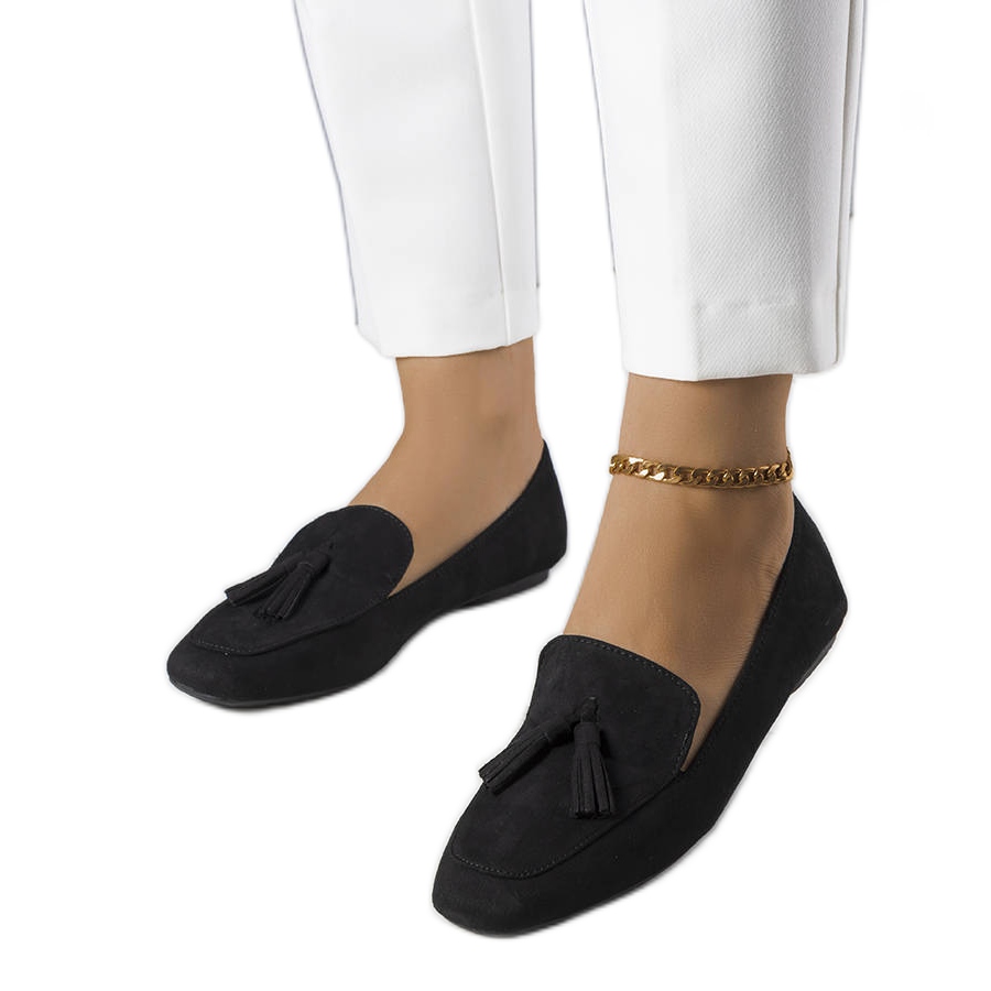 Wir präsentieren schwarze Cillian-Ballerinas aus Öko-Wildleder des Herstellers PA1 – die perfekte Kombination aus Eleganz und Komfort. Diese stilvollen Mokassins zeichnen sich durch eine modische quadratische Spitze aus, die sie im Vergleich zu klassischen Modellen originell macht. Diese Ballerinas aus hochwertigem Wildleder-Ökoleder sorgen nicht nur für einen eleganten Look, sondern auch für hohen Tragekomfort.