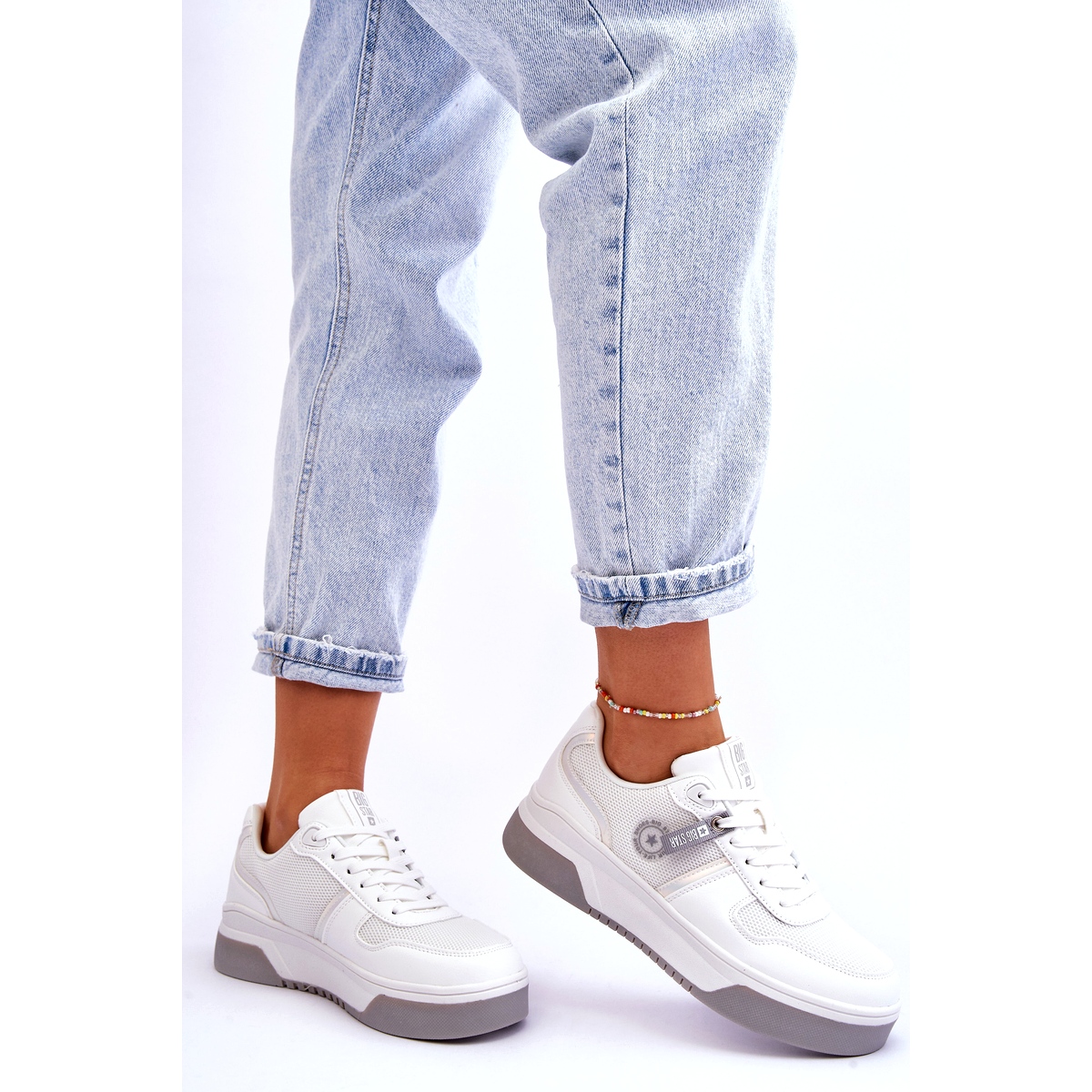 Elegante und universelle Frauen -Star -Sneakers, die jeden Tag den Alltagsstil mit Komfort kombinieren. Die obere aus der Kombination aus Textilmaterial und ökologischem Leder in zeitloser weißer Farbe, dekoriert mit einem subtilen Logo.