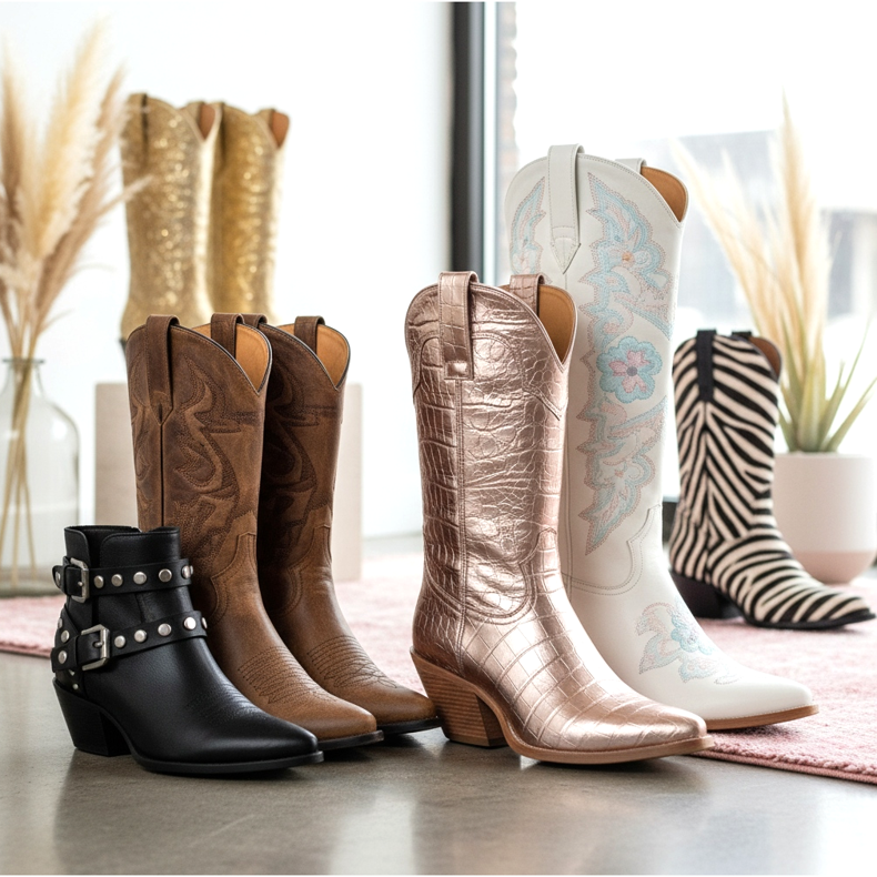 Moderne Cowboystiefel müssen nicht wie eine Requisite aus einem Westernfilm aussehen. Designer bieten Modelle in einer breiten Farbpalette an – von klassischem Braun und Schwarz bis hin zu Pastellrosa, Goldmetallic und Tiermustern. Kurze Stiefeletten im Western-Stil, Overknee-Modelle und klassische Midi-Boots – hier findet jeder etwas für sich.