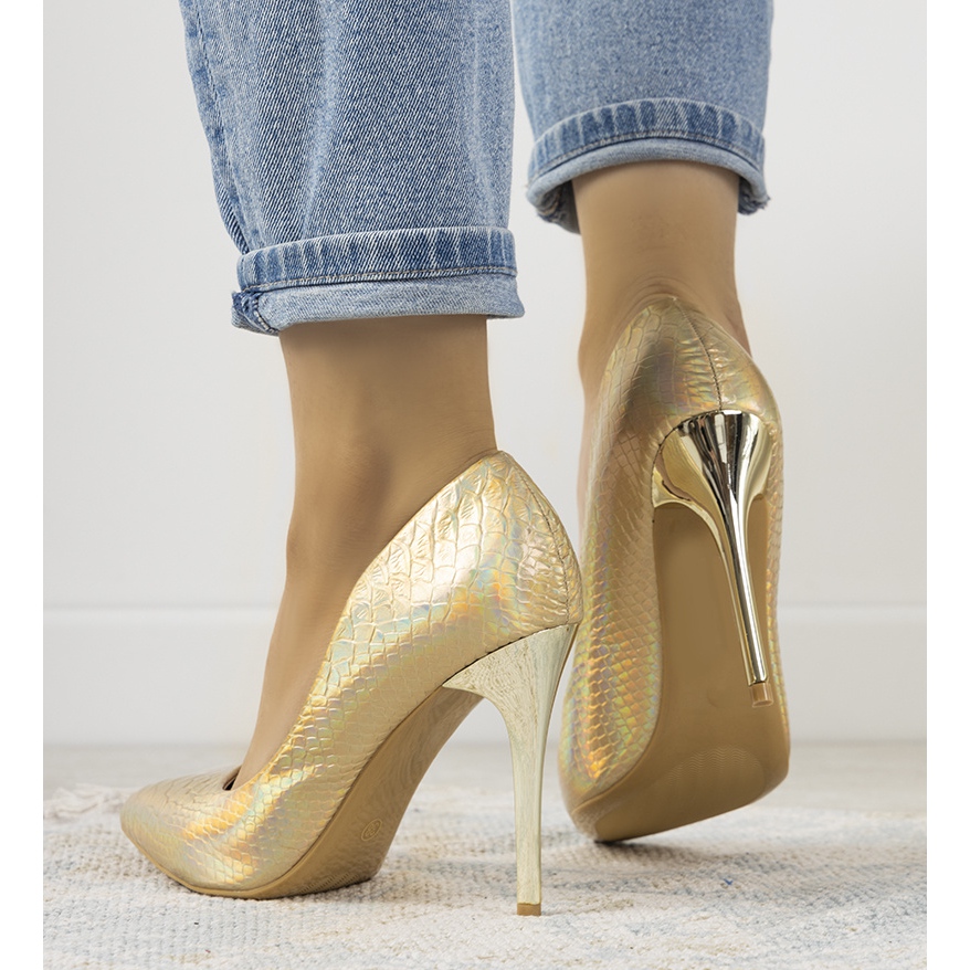 Entdecken Sie außergewöhnliche Eleganz und ein bisschen Glanz mit goldenen holografischen Craigie-High-Heels! Diese einzigartigen Pumps sind die perfekte Wahl für jede Veranstaltung und ziehen durch ihre Originalität und einzigartige Verarbeitung die Aufmerksamkeit auf sich. Die holografische Oberfläche lässt jeden Schritt magisch wirken und dezente Lichtreflexe verleihen ihm einen einzigartigen Charakter.