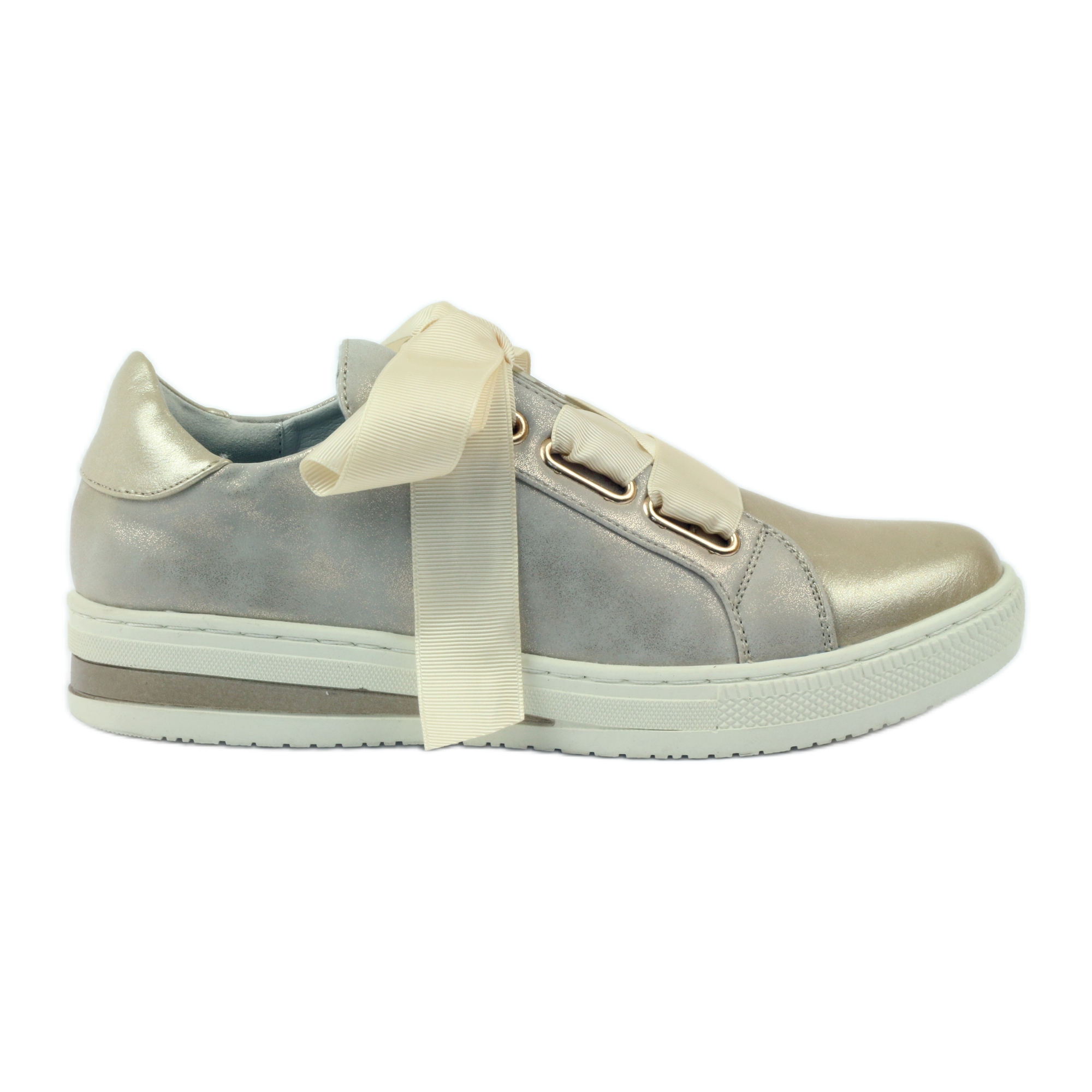 Diese goldenen Schuhe zeichnen sich durch dekorative Riemen aus, durch die ein stilvolles Band gefädelt ist, was ihnen einen einzigartigen Charakter verleiht und sie zu einem Blickfang macht. Auf einer flachen, weißen, 3 cm hohen Sohle sitzend, verlängern sie sanft die Beine und sorgen gleichzeitig für Stabilität und Tragekomfort.