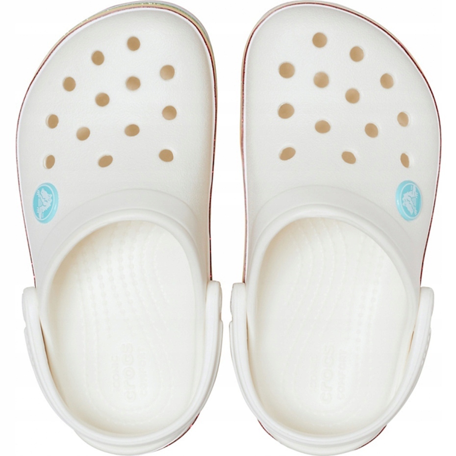 Ein leichtes und bequemes Angebot für Mädchen - klassischer Crocs Crocband in einer weißen Version mit einem farbenfrohen, schimmernden Regenbogenglittergürtel. Hergestellt aus Croslite ™ -Material zur Dämpfung, antibakterieller Auskleidung und einfacher Reinigung. Perfekt für den Strand, den Schwimmbad und für den täglichen Gebrauch.