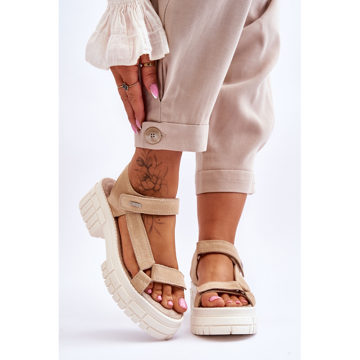 Diese aus natürlichem Wildleder gefertigten Sandalen zeichnen sich durch eine weiche Innensohle aus Öko-Wildleder aus, die auch bei langen Spaziergängen für Komfort sorgt. Das auf einem 3,5 cm hohen Plateau und einem flachen Absatz (5,5 cm) montierte Modell macht sie nicht nur stilvoll, sondern auch stabil. Der Klettverschluss ermöglicht ein einfaches Anziehen und Anpassen an den Fuß, was sie zu einer praktischen Lösung für jeden Anlass macht.