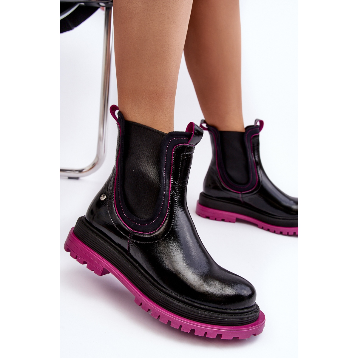 Moderne, modische Stiefel des polnischen Herstellers Maciejka, bestehend aus lackiertem Naturleder. Sie zeichnen sich durch eine massive Gummi -Sohle in einer kontrastierenden Fuchsia/Pink -Farbe und einer breiten, flachen Ferse aus, die beim Gehen Stabilität und Komfort gewährleistet. Ideales Modell für die Herbst/Winter -Saison - ein stilvoller Akzent für alltägliche und halb formelle Stilisierungen.