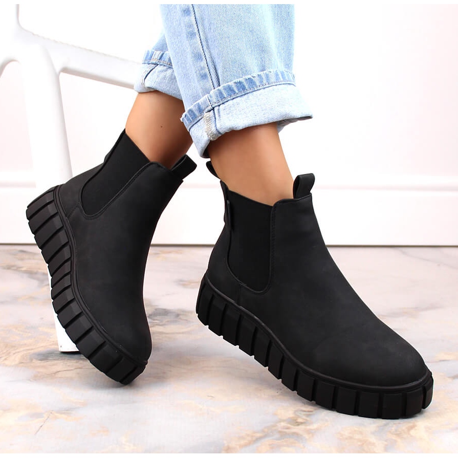 Die Stiefel sind aus hochwertigem Faux-Wildleder in klassischem Schwarz gefertigt, wodurch sie perfekt zu verschiedenen Kleidungsstücken passen – von lässigen Jeans bis hin zu eleganteren Hosen oder Kleidern. Ein charakteristisches Merkmal des Modells ist eine solide Plattform mit einer Höhe von etwa 4 cm, die nicht nur eine zusätzliche Isolierung vor dem kalten Boden, sondern auch eine dezente Erhöhung ohne Belastung der Füße garantiert. Die schwarze Sohle ist dick und gut geformt, was für Stabilität sorgt und das Gehen auch auf nassem Untergrund erleichtert.