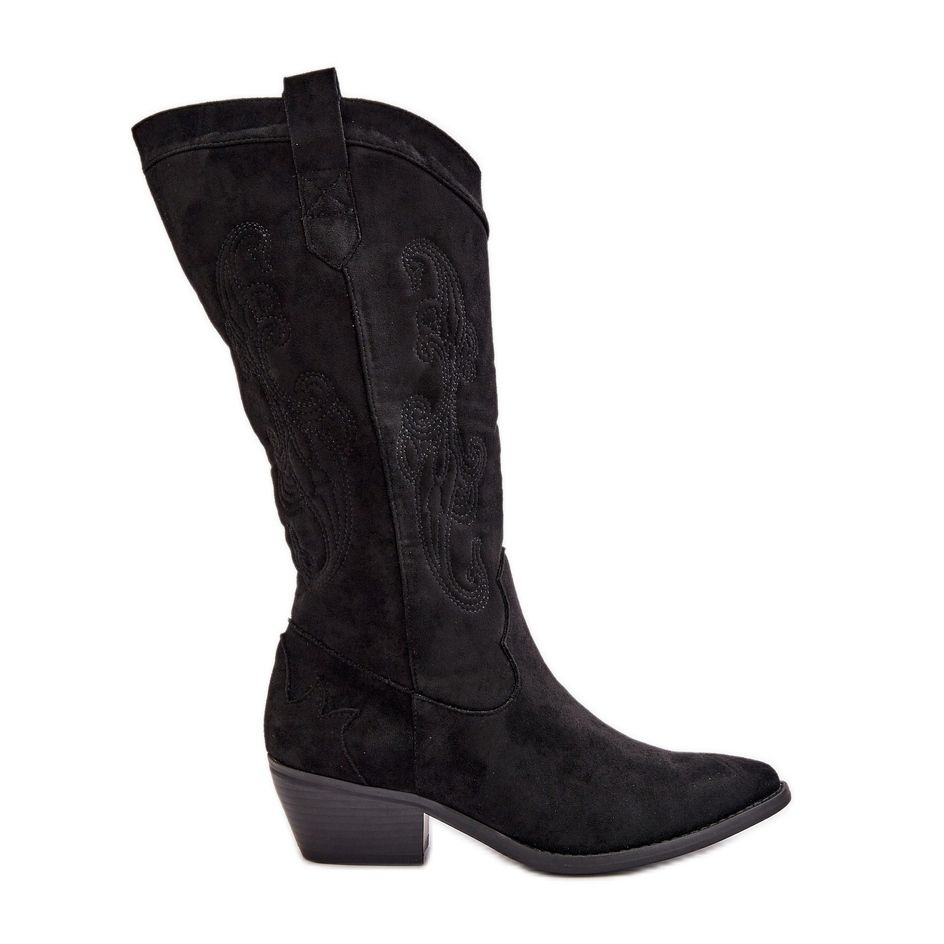 Entdecken Sie die einzigartigen Cowboy -Stiefel für Frauen mit niedrigem Frauen mit Öko -Wildleder in einer eleganten schwarzen Farbe. Dies ist eine gute Wahl für Frauen, die Komfort mit modischem Stil kombinieren möchten. Das Modell, das auf 5 cm hoher stabiler Ferse eingestellt ist, ist täglich perfekt und bietet während eines langen Verschleißes Komfort.