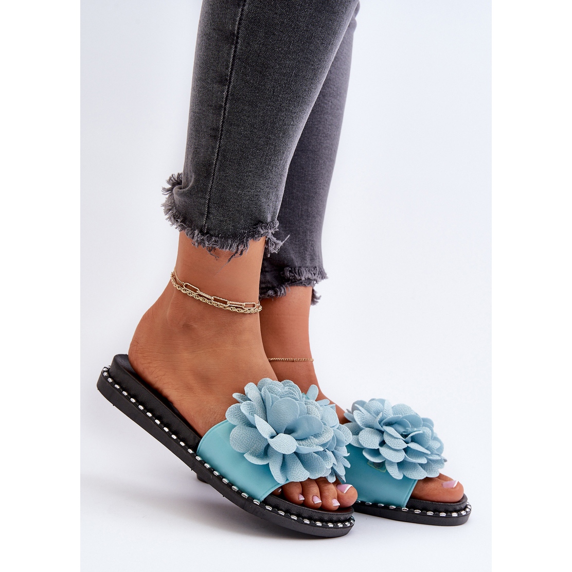 Damenflip -Flops mit blauen Cellanenblumen sind die perfekte Wahl für warme, Frühlings- und Sommertage. Ihre wirksame Dekoration in Form von Blumen fällt ins Auge und verleiht jeder lässigen Stylisierung ein bisschen Eleganz und Stil. Der klassische Schnitt von Flip -Flops macht sie äußerst vielseitig - sie passen perfekt sowohl Strandoutfits als auch alltägliche städtische Stylisationen.