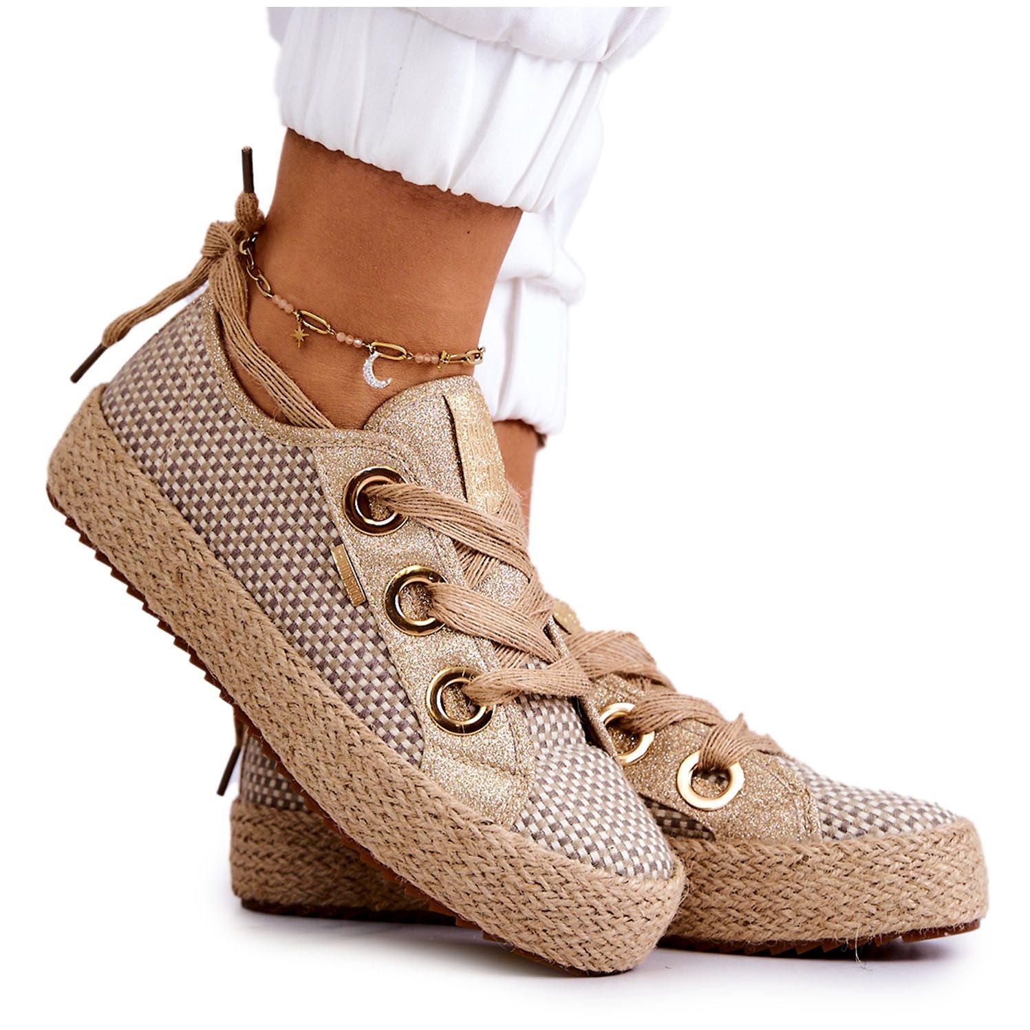 Details: Damen geflochtene Turnschuhe Big Star JJ274392 Beige und Gold
