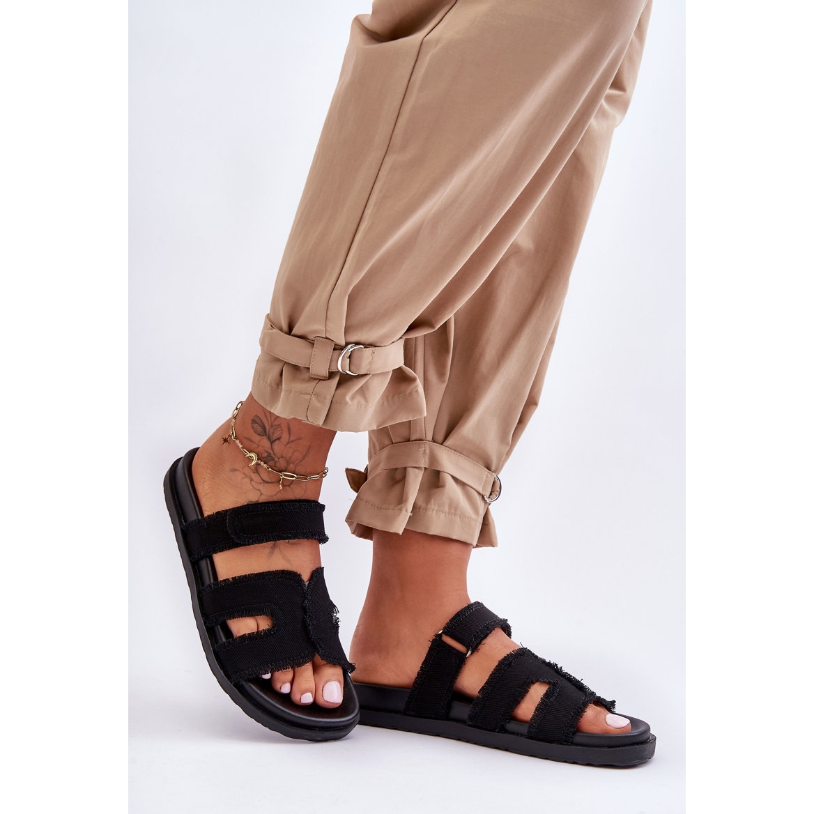 Ein einfacher, funktionaler Schnitt funktioniert im täglichen Gebrauch - für einen Spaziergang, zur Arbeit oder im Urlaub. Einstellbarer Klettverschluss sorgt selbst für einen variablen Fuß des Fußes, und die schwarze Farbe kombiniert sich problemlos mit unterschiedlichen Stilisationen.