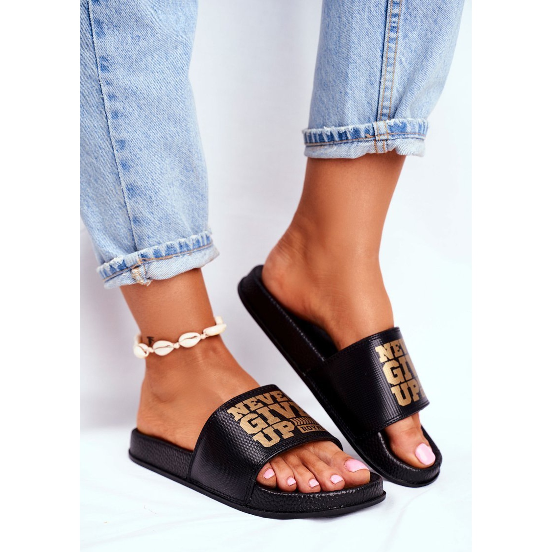 Details: ADY Damen Hausschuhe Never Give Up Gold Schwarz gelb