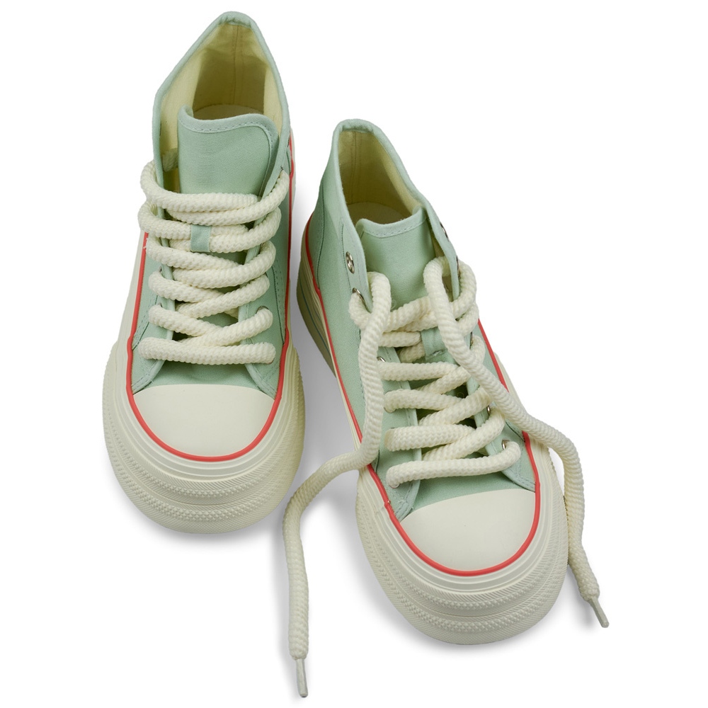 Entdecken Sie den neuesten Treffer im Frühling/Sommer - Frauen -Sneaker auf einer dicken Sohle über dem Knöchel in einem modischen, leichten Grünton. Diese einzigartigen Schuhe, die von einer seriösen Marke produziert werden, sind eine perfekte Kombination aus Stil und Komfort, die sicherlich aussieht.