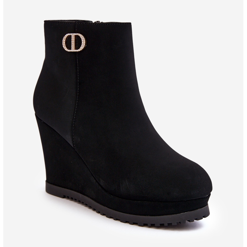 Elegante, schwarze Knöchelstiefel von WJ2, montiert auf einem stabilen Keil und einer Plattform. Das Modell kombiniert den Komfort des Tragens mit einer subtilen, glänzenden Dekoration im Obermaterial, dank der es sowohl jeden Tag als auch für stilvollere Sets in der Herbst/Winter -Saison funktionieren wird.