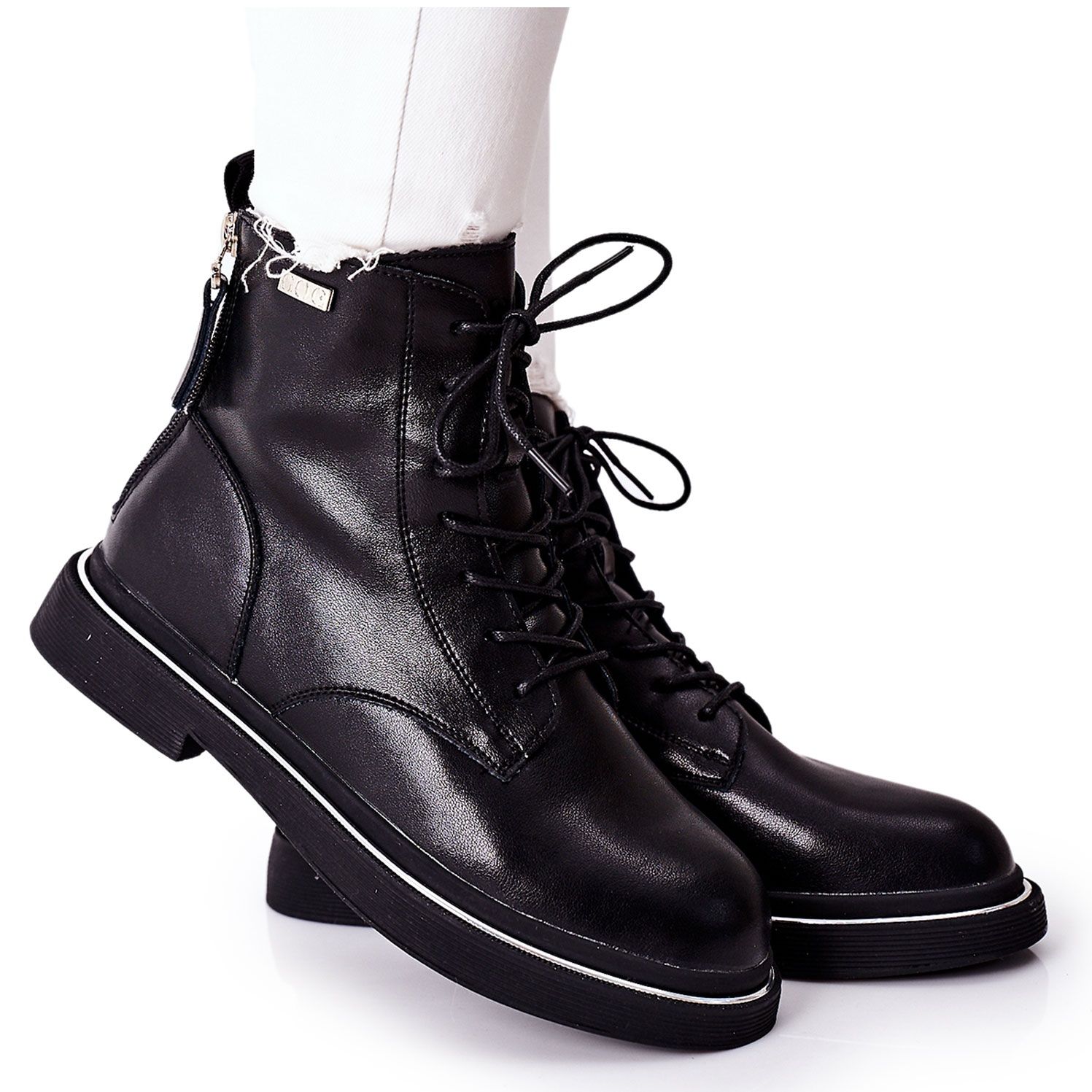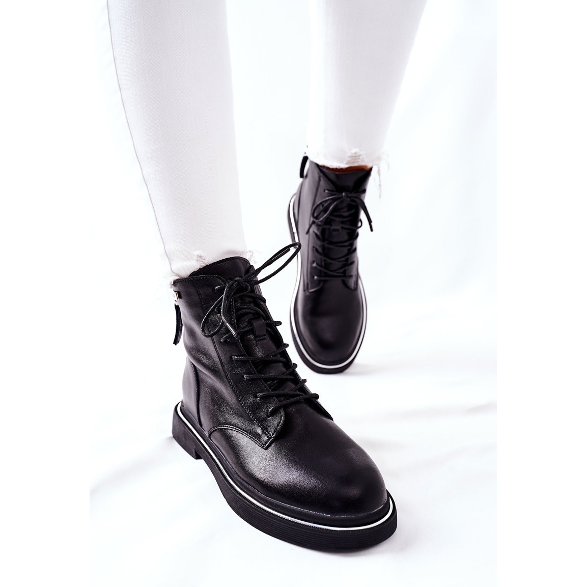 Diese Stiefel sind eine bequeme und langlebige Lösung für kühlere Tage - natürliches Leder bietet Komfort und Ästhetik, und die Erwärmung hält Wärme aufrecht. Zwei Schieberegler im Rücken erleichtern das Anziehen, und die stabile Sohle mit einer subtilen Dekoration betont die modische Natur der Schuhe.