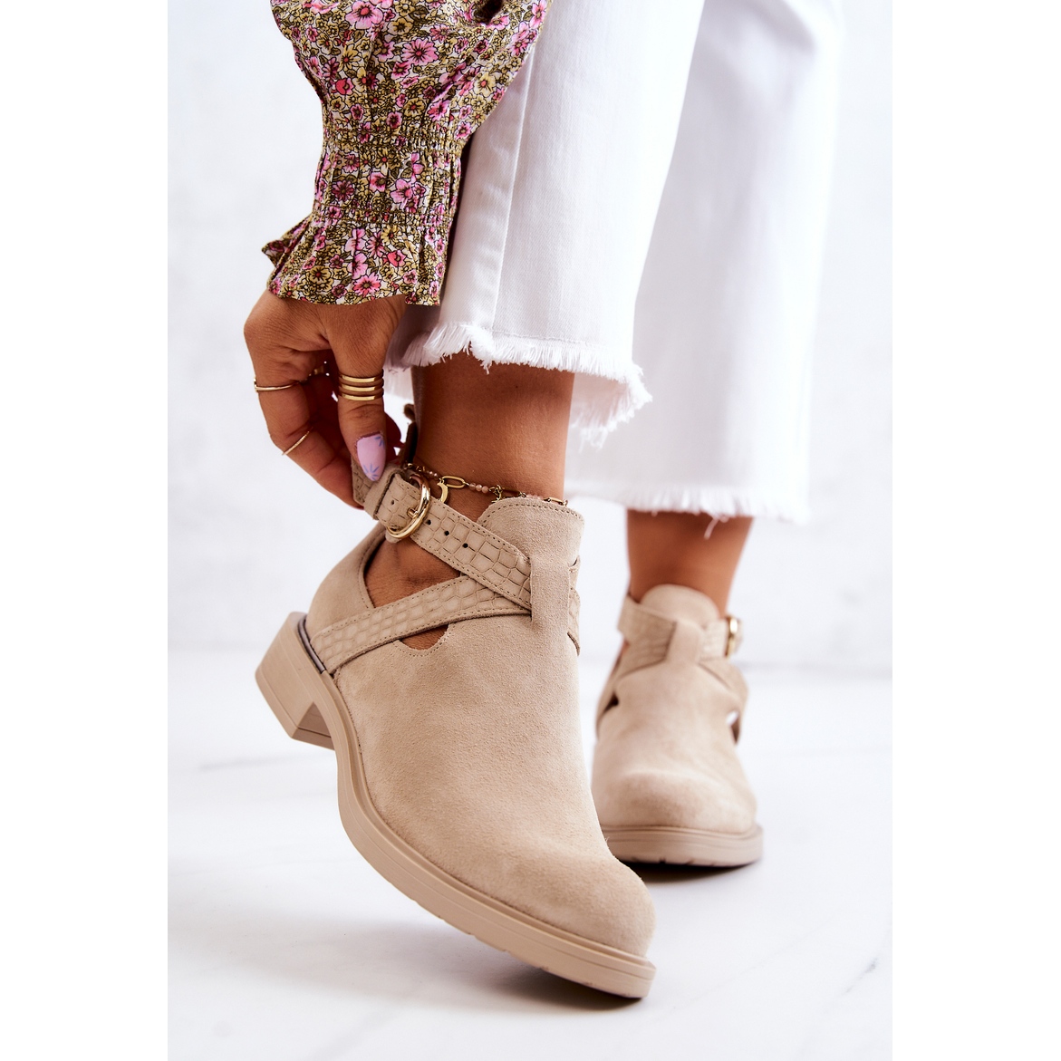 Die Stiefel zeichnen sich durch ihren modischen Schnitt aus und die phänomenalen Ausschnitte an den Seiten des Obermaterials machen sie leicht und modern. Der mit einer Schnalle befestigte verstellbare Riemen ermöglicht eine perfekte Anpassung an den Fuß, was den Tragekomfort erhöht. Ein flacher 3,5 cm hoher Absatz sorgt für Stabilität und macht diese Stiefel zu einer idealen Wahl für jeden Tag und verschiedene Anlässe.