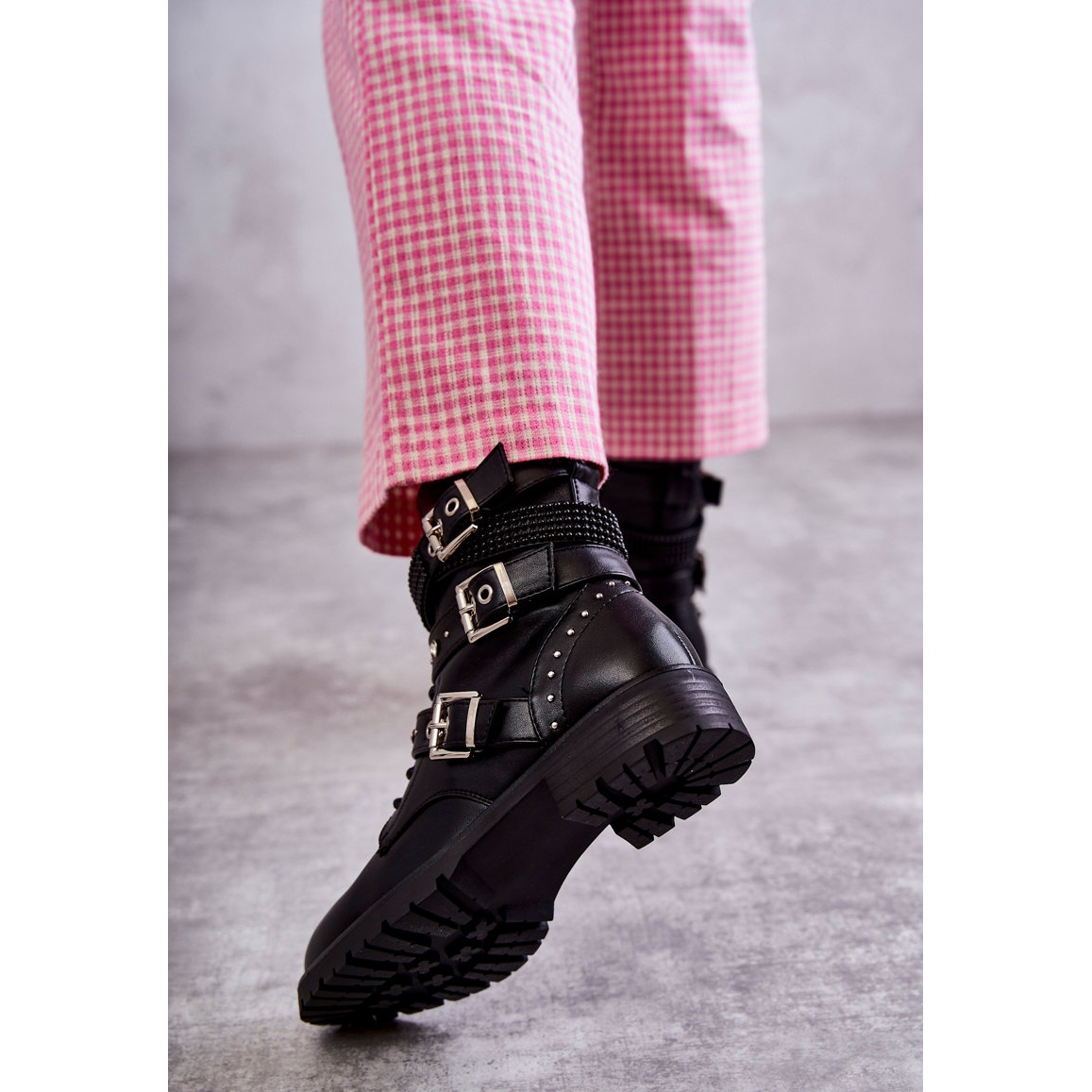 Stilvolle, schwarze Stiefel aus hochwertigem ökologischem Leder. Das Obermaterial mit verstellbaren Streifen mit Schnallen, Stiften und Zirkonen, die Charakter und subtiles Leuchten verleihen. Das Modell wurde mit einem Reißverschluss befestigt und zusätzlich geschnürt, dank dessen sich es perfekt an den Fuß anpasst. Der mit einer weiche Schuhedecke ausgekleidete Innenraum bietet an kühleren Tagen Wärme und Komfort. Eine empfindliche Plattform und eine flache Ferse mit einer Höhe von etwa 3,5 cm garantieren bei jedem Schritt die Stabilität. Die Stiefel greifen nach dem Knöchel und haben eine abgerundete Nase.