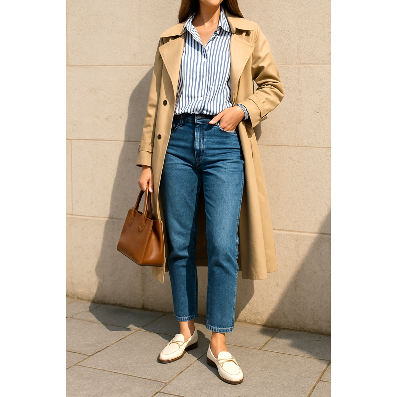 Tragen Sie weiße oder cremefarbene Leder-Loafer zu klassischen, gerade geschnittenen Blue Jeans. Kombinieren Sie sie mit einem gestreiften Hemd und einem beigen Trenchcoat und kreieren Sie ein Styling ganz im Sinne der Pariser Eleganz. Dieser Look ist perfekt für einen Spaziergang durch die Stadt, ein Treffen mit Freunden oder einen Einkaufsbummel. Helle Slipper verlängern optisch Ihre Beine und verleihen dem gesamten Look Leichtigkeit.