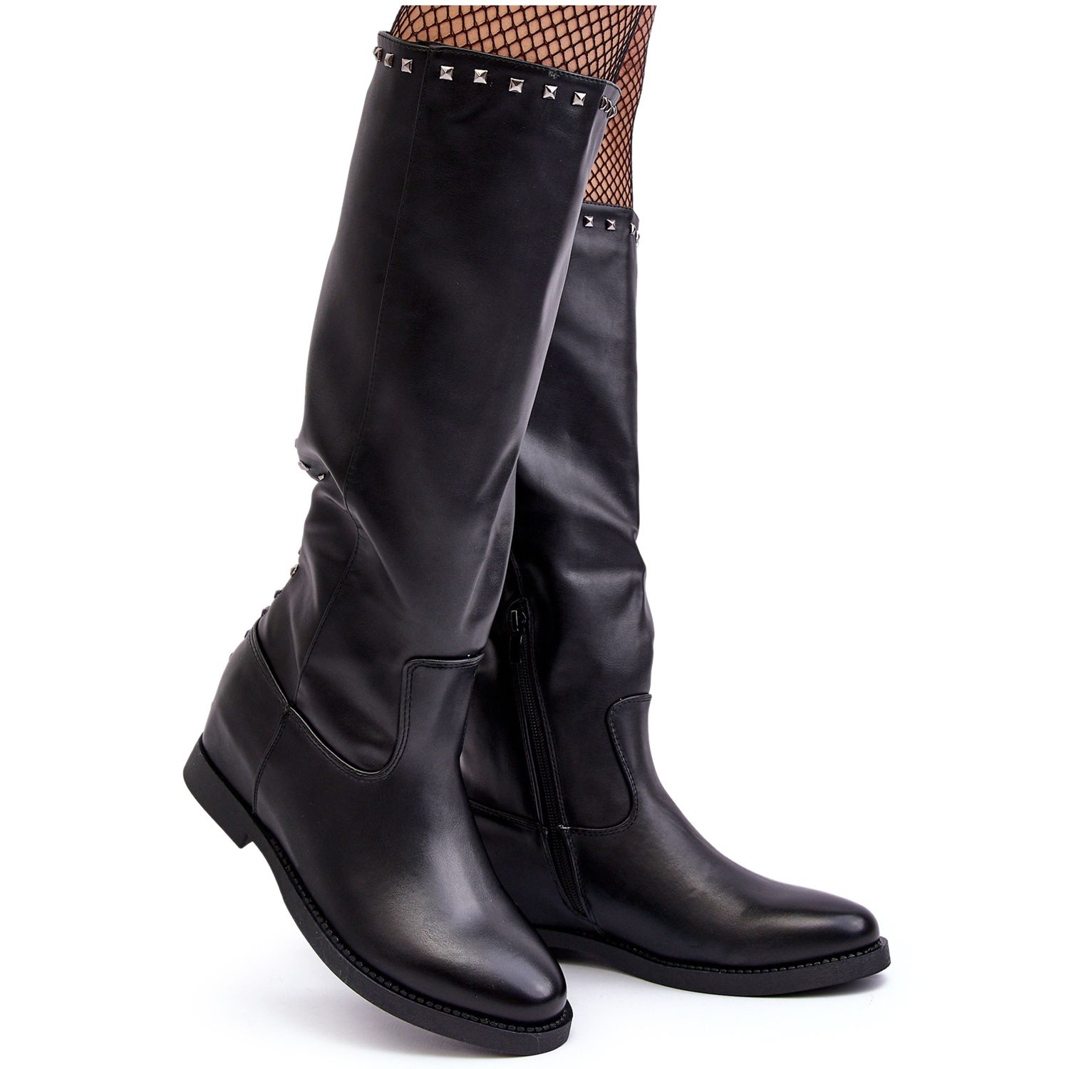 Elegante und komfortable Stiefel vor dem Knie aus Eco -Leder - perfekt für die Herbst/Winter -Saison. Ein Modell mit einem klassischen Schnitt, eingebettet in eine niedrige, flache Ferse (2 cm), mit einem dekorativen Obermaterial mit Metallstollen. Die eingefügte Struktur wurde mit einer zusätzlichen kurzen Schloss am unteren Rand des Oberen oberen erleichtert.