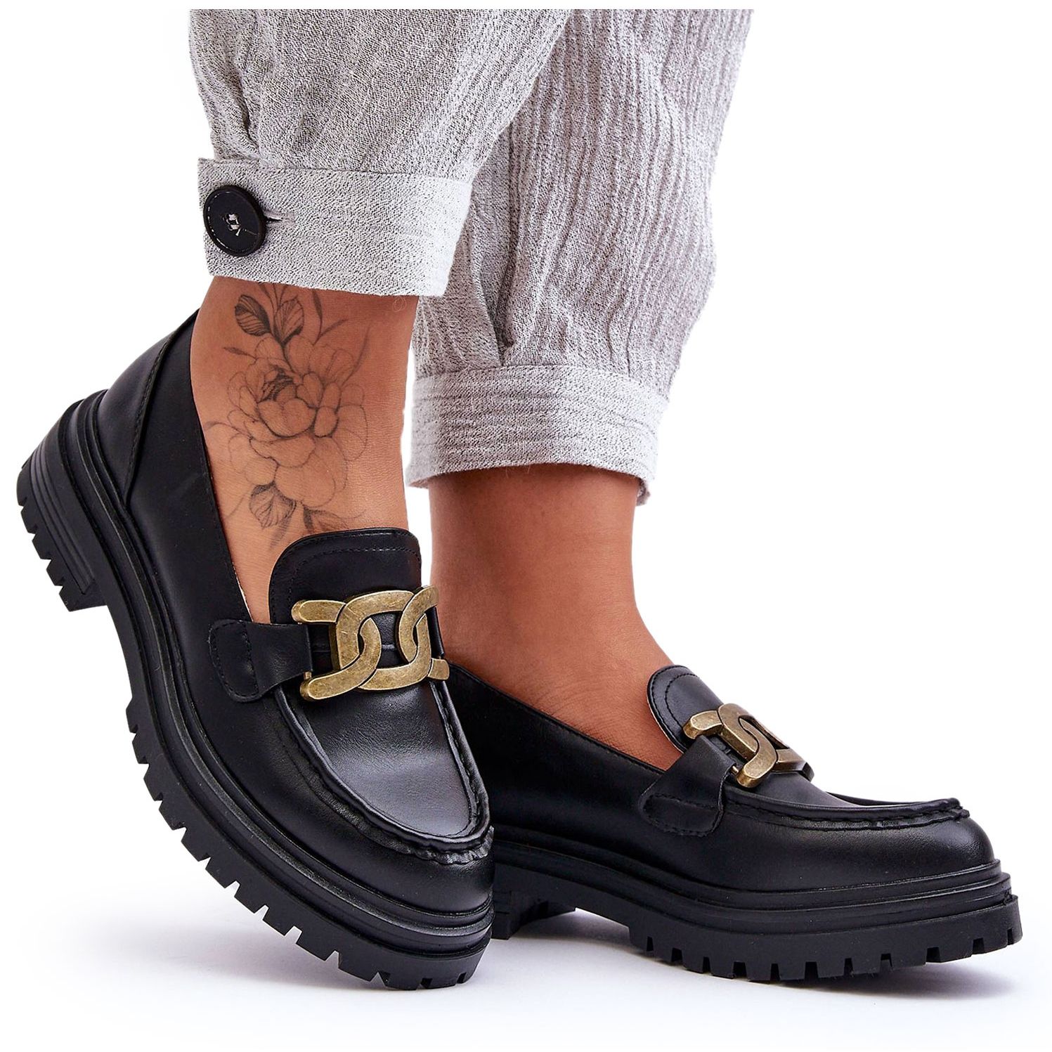 Die schwarze Farbe der Schuhe wird durch eine goldene Verzierung in Form einer Kette auf der Vorderseite ergänzt, die den Mokassins einen einzigartigen, eleganten Charakter verleiht. Einfache, aber wirkungsvolle Dekoration wird Aufmerksamkeit erregen und jedem Styling Eleganz verleihen – von lässigen Jeans bis hin zu eleganten Hosen und Röcken.