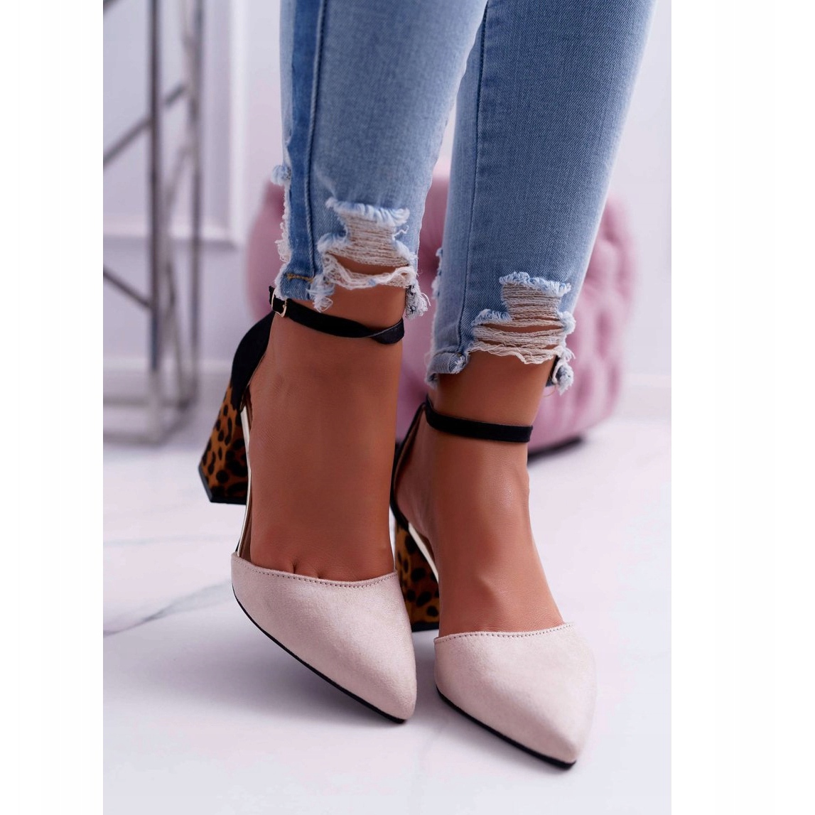Entdecken Sie Klassiker in einer modernen Version mit Damenpumps auf dem Absatz Panterki Beige Ferri! Diese eleganten Schuhe in gedämpften Beigetönen erhalten durch ein zartes Leopardenmuster einen originellen Charakter. Sie bestehen aus hochwertigem ökologischem Wildleder und bieten nicht nur einen stilvollen Look, sondern auch Tragekomfort.