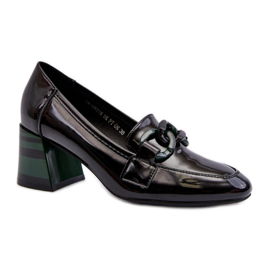 Wir präsentieren elegante Frauenpumpen auf einem schwarzen Pfosten mit einer subtilen Dekoration in Form einer Kette an der Vorderseite des Obermessens. Diese einzigartigen Schuhe, die aus hochwertigem natürliches Leder bestehen, kombinieren Stil und Komfort, was sie zu einer idealen Wahl für die Arbeit und verschiedene Familienfeierlichkeiten macht.