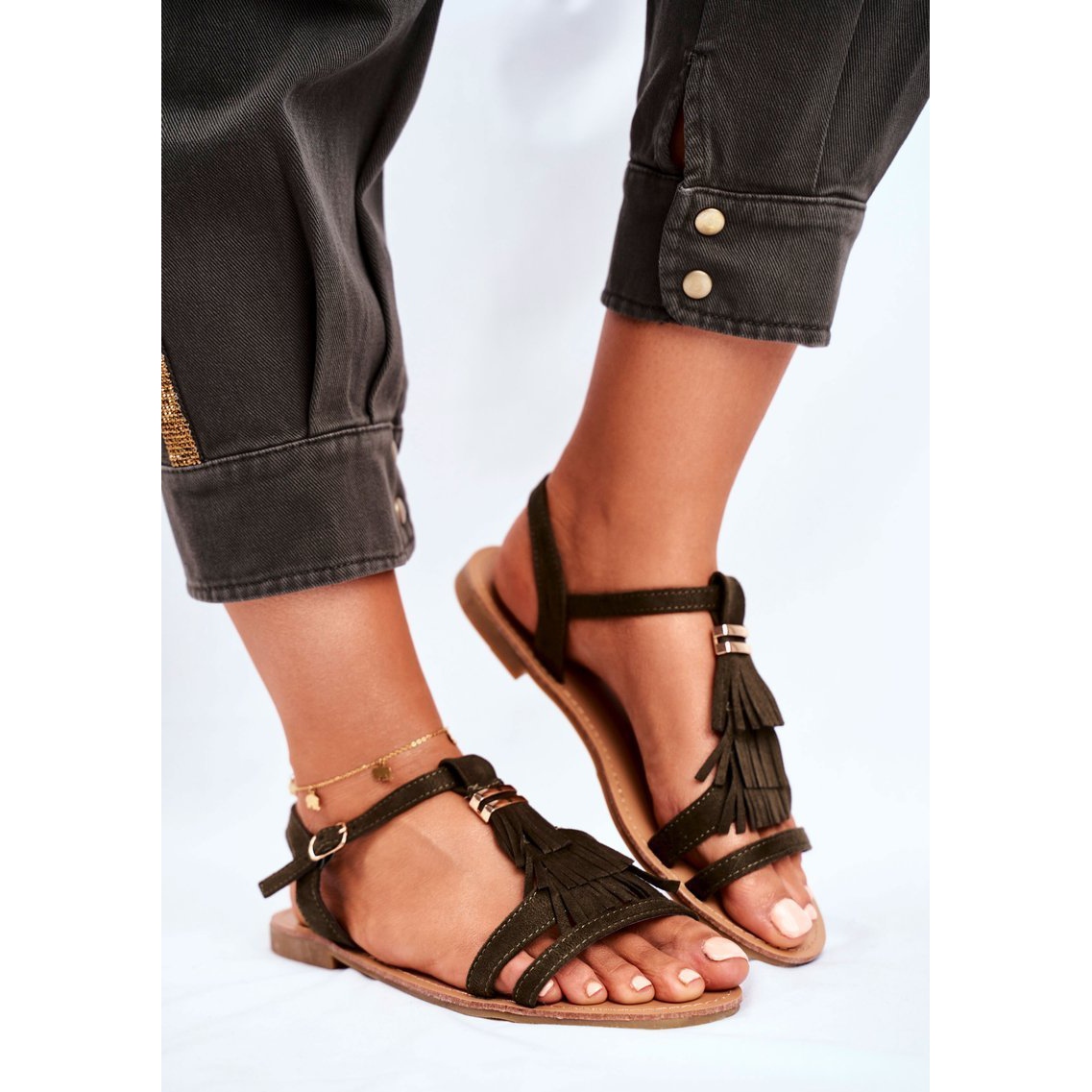 Entdecken Sie sommerliche Eleganz mit den FJ1-Sandalen für Damen im Boho-Stil! Diese einzigartigen olivfarbenen Sandalen sind die perfekte Wahl für jeden Sommeranlass. Sie sind aus hochwertigem Öko-Wildleder gefertigt und fühlen sich nicht nur angenehm an, sondern sind auch sehr bequem. Die Fransenverzierung verleiht ihnen einen einzigartigen Charakter und hebt sie von anderen Modellen ab.