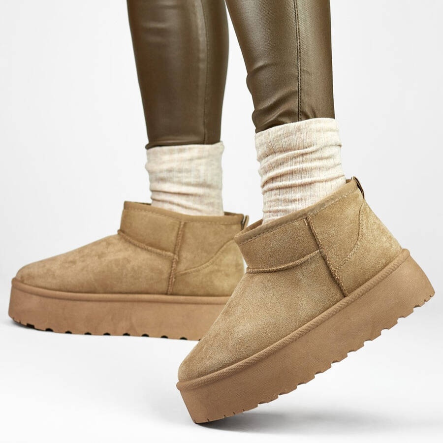 Damenschnee-Stiefel auf der Plattform im dunklen Beige TL242-kh sind die perfekte Wahl für kalte Tage. Sie bestehen aus ökologischem Wildleder und bieten nicht nur einen modischen Look, sondern auch einen Komfort des Gebrauchs. Die Höhe der oberen 9 cm und die Standardbreite von 19 cm passen sich perfekt an das Bein an, und die runde Nase verleiht ihnen Charme.