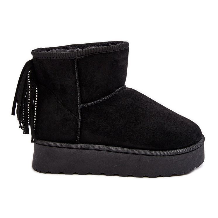 Frauen -Lirico -Schneestiefel - warm, stilvoll und komfortabel für kühlere Tage. Hergestellt aus ökologischem Wildleder in universellem Schwarz, montiert auf einer massiven Gummi -Sohle (4 cm -Plattform). Der Obere erreicht den Knöchel und wurde mit dekorativen Rändern im Rücken dekoriert, und das Innenraum ist mit dickem Fell gepolstert, was den thermischen Komfort während der Herbst/Winter -Saison gewährleistet.