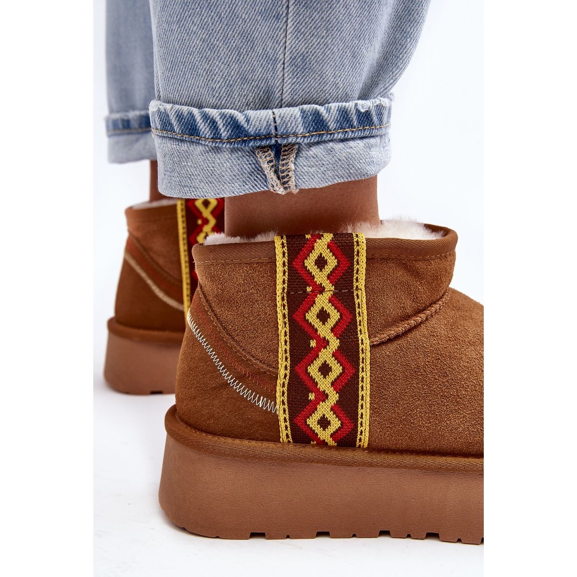 Wenn man auf die Details achtet, ist es unmöglich, das Aztekenmuster zu übersehen, das diese Schneestiefel ziert und ihnen Charakter und einen unverwechselbaren Stil verleiht. Dies ist ein auffälliges Element, das das Schuhwerk nicht nur praktisch, sondern auch zu einer modischen Ergänzung des Winter-Stylings macht.