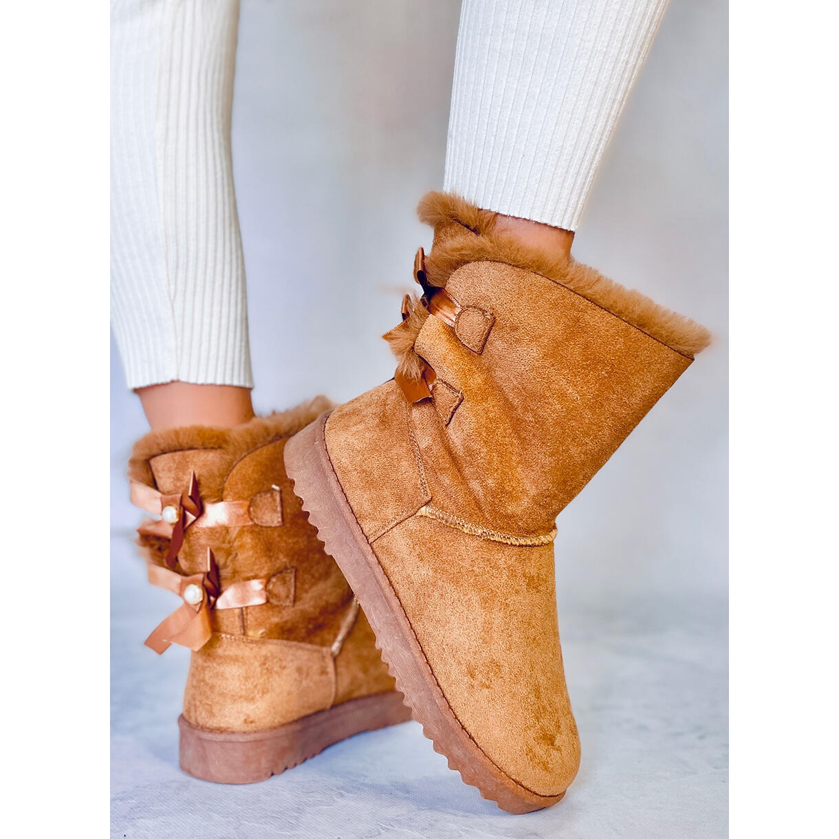 Der größte Vorteil dieses Modells sind die bezaubernden Schleifen auf der Rückseite des Obermaterials, die den Schuhen einen einzigartigen Charakter verleihen. Dank ihnen wird jeder Schritt stilvoll und Sie heben sich von der Masse ab. Die Schneestiefel sind aus ökologischem Wildleder gefertigt, was sie umweltfreundlich macht, und eine zusätzliche flache Sohle, 2,5 cm hoch, sorgt für Alltagskomfort.