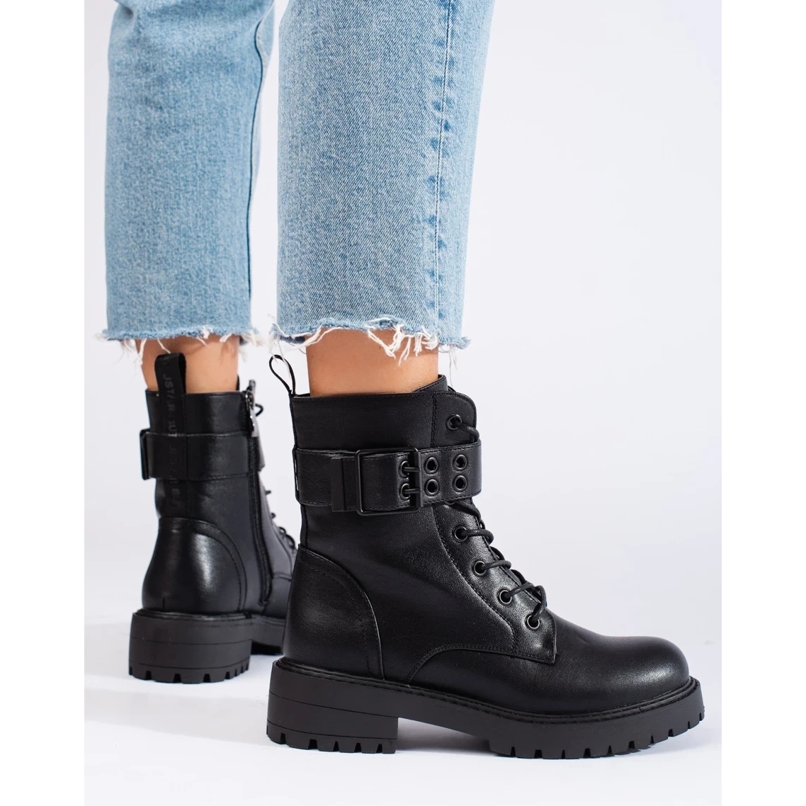Stilvolle und praktische Arbeiter, die in der Herbst- und Wintergarderobe arbeiten. Sie bestehen aus hochwertigem ökologischem Leder, mit Erwärmung und einer Schuhdecke im Innenraum - sie sorgen für den täglichen Gebrauch. Der klassische Rockcharakter wird durch Schnürung und eine solide Sohle mit einem Profil betont.