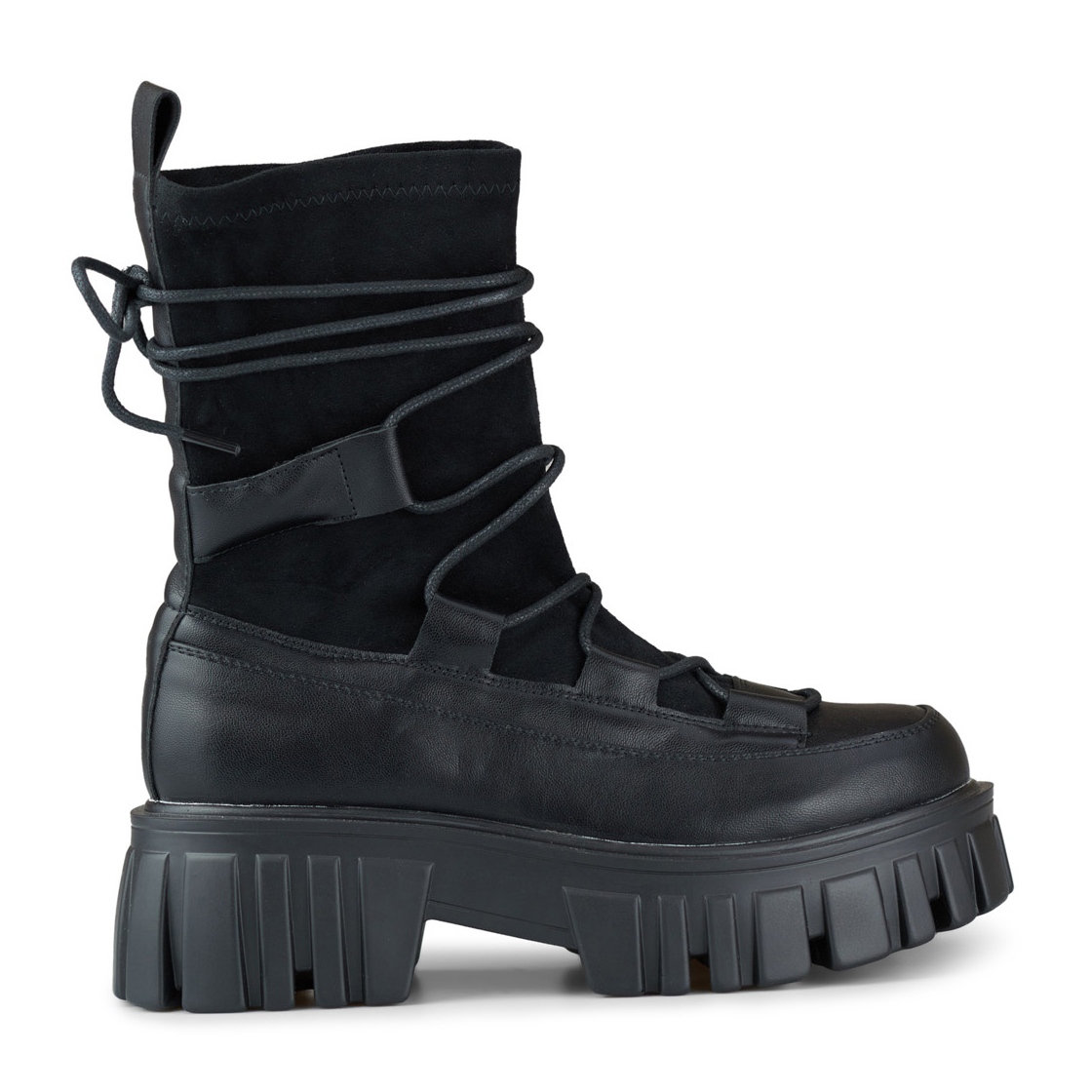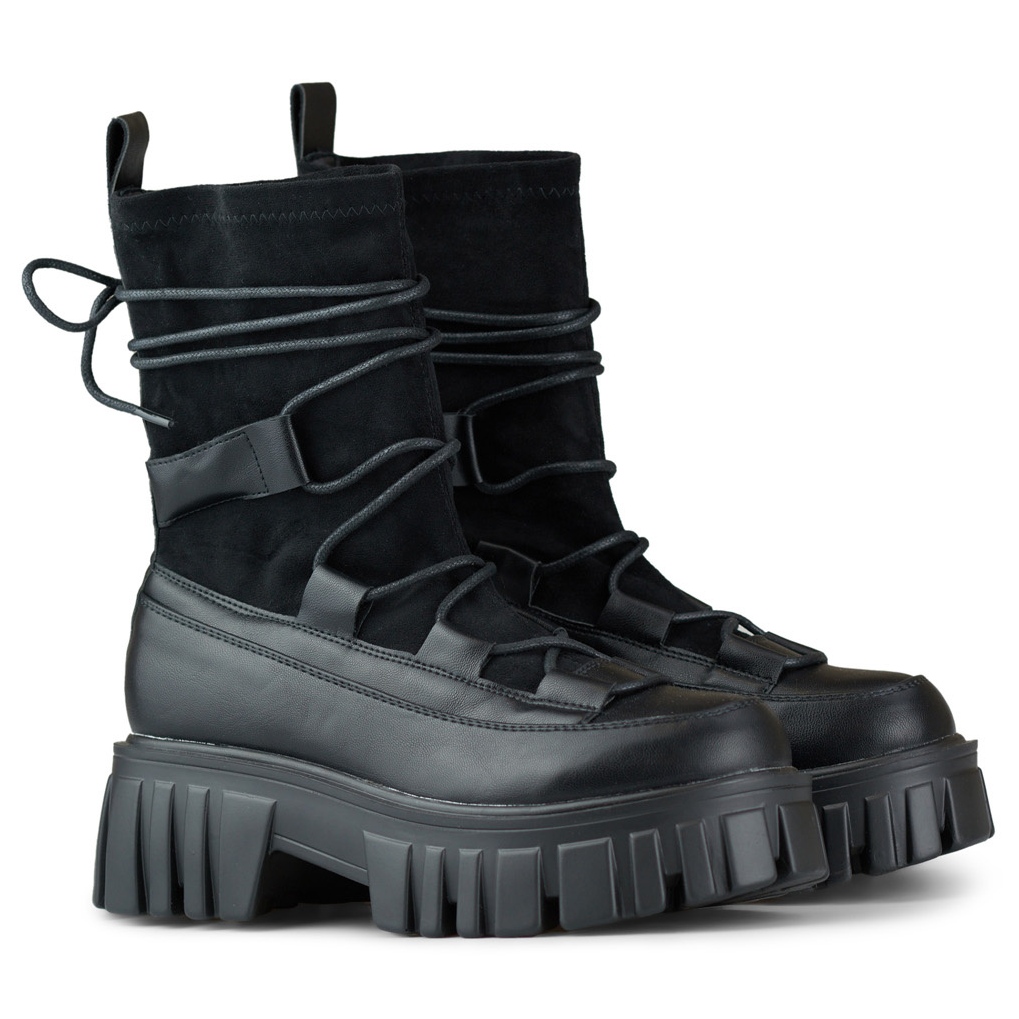Gebundene Frauenstiefel auf der Plattform - schwarz, elegant und komfortabel. Perfekt für die Herbst-/Wintersaison, kombinieren sie einen modischen Look mit praktischen Lösungen: Eine flexible obere Insertion und die Isolierung liefert an kühleren Tagen Wärme.