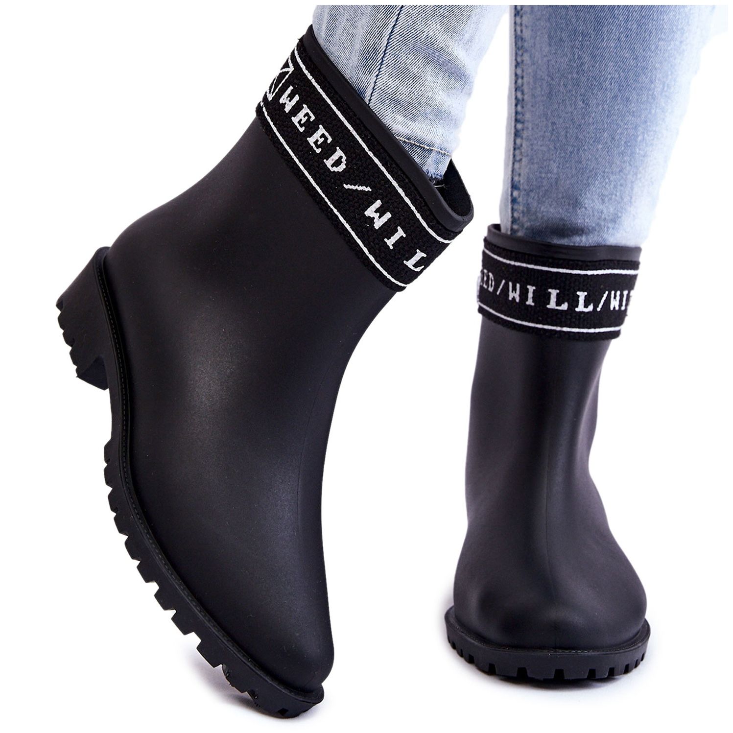 Das Design dieser Gummistiefel zum Hineinschlüpfen, verziert mit einem charakteristischen Streifen mit Aufschrift auf dem oberen Teil des Schafts, passt sich den Modekanonen an und behält gleichzeitig die Funktionalität von Schuhen für schlechtes Wetter bei. Das schwarze Design ermöglicht eine flexible Anpassung an verschiedene Stilrichtungen – von lässig bis formell.