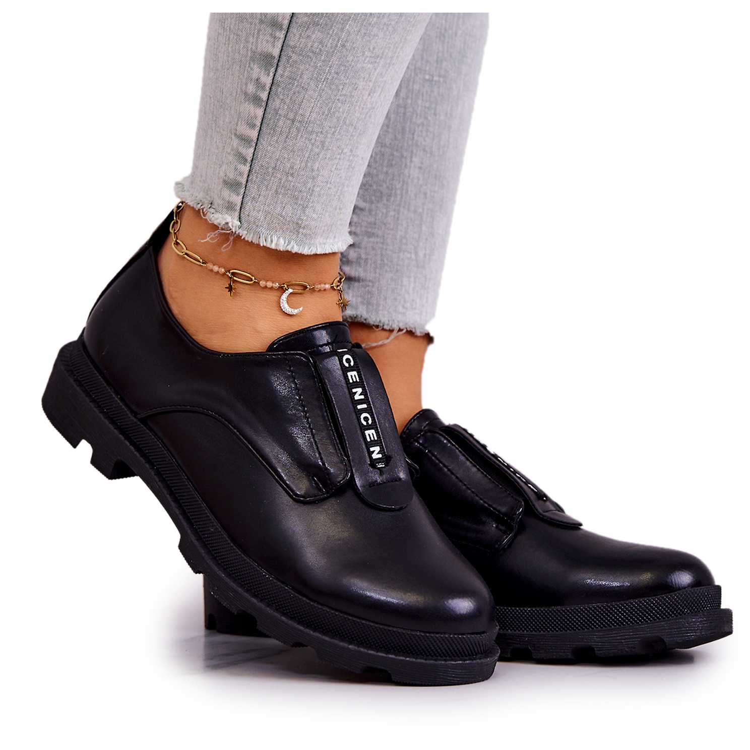 Die Schuhe haben eine versteifte Ferse, die den Fuß zusätzlich stützt. Dank ihrer universellen schwarzen Farbe lassen sich die Schuhe mit verschiedenen Stilrichtungen kombinieren – sowohl lässig als auch eleganter.