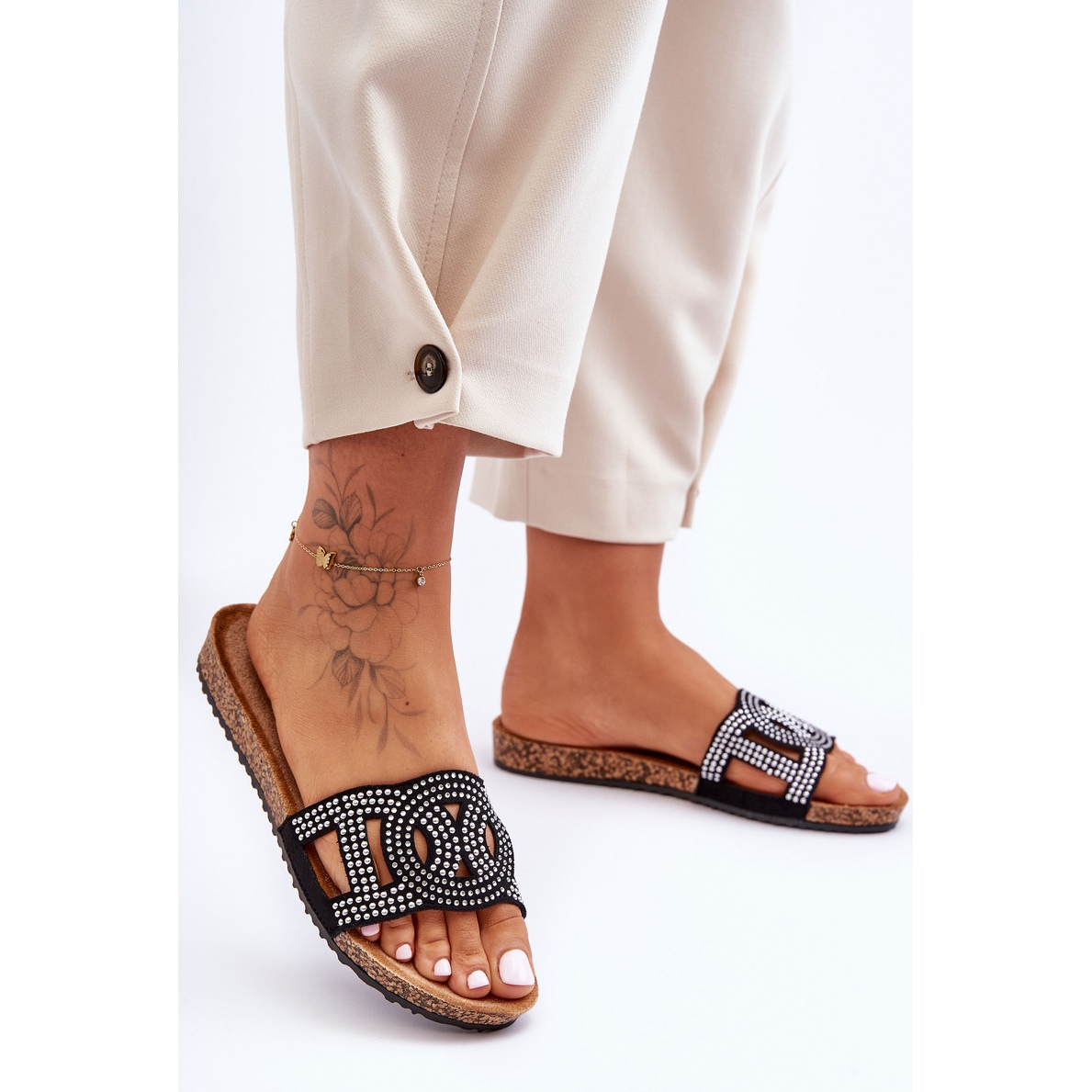 Stylische und komfortable Flip -Flops ideal im Frühling und Sommer. Hergestellt aus angenehmem ökologischem Leder, dekoriert mit modischen Silbernieten (Strasssteinen) vorne. Der profilierte Einsatz aus demselben Material bietet Komfort bei Spaziergängen und täglichen Ausgaben, und die Cork -Kunststoffsohle sorgt für Leichtigkeit und lässige Charakter.