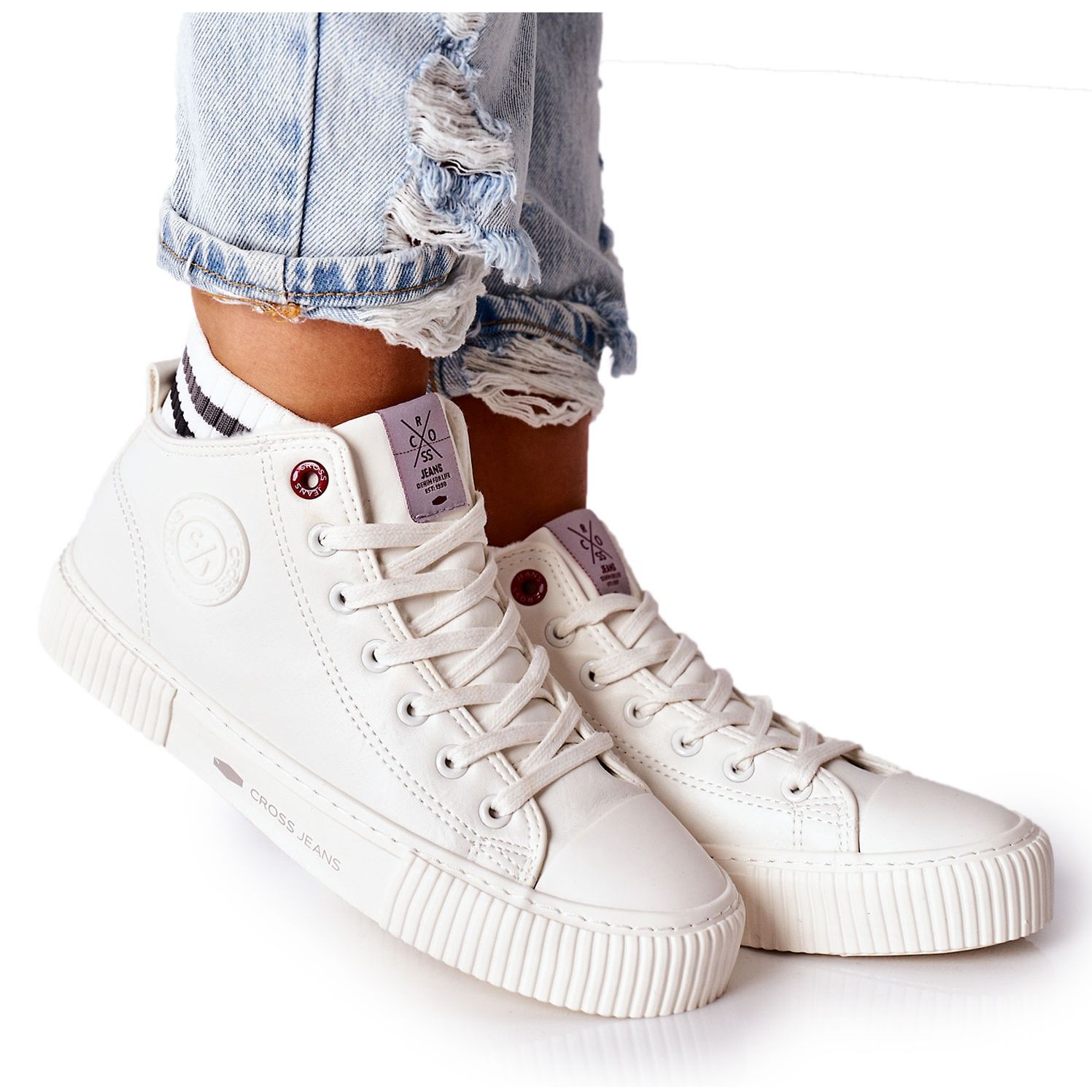 Damen -Sneaker Cross Jeans Wysokie White II2R4022 - Klassiker in einer modernen Ausgabe. Elegante, hohe Turnschuhe aus ökologischem Leder, die einen modischen Look mit alltäglichem Komfort kombinieren. Perfekt für städtische Stile - von Jeans bis zu Sommerkleidern.