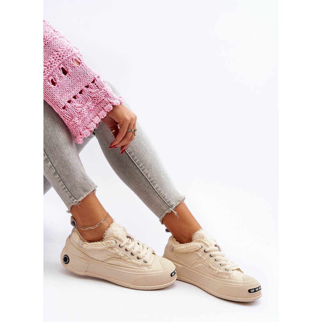 Ihre massive, 4,5 cm hohe Plattform aus Gummimaterial verleiht nicht nur Stil, sondern dämpft auch jeden Schritt, was sie perfekt für lange Spaziergänge macht. Die runde Spitze und der Schnürverschluss sorgen für eine gute Passform am Fuß und das Obermaterial in Stoffform macht die Schuhe luftig und leicht.