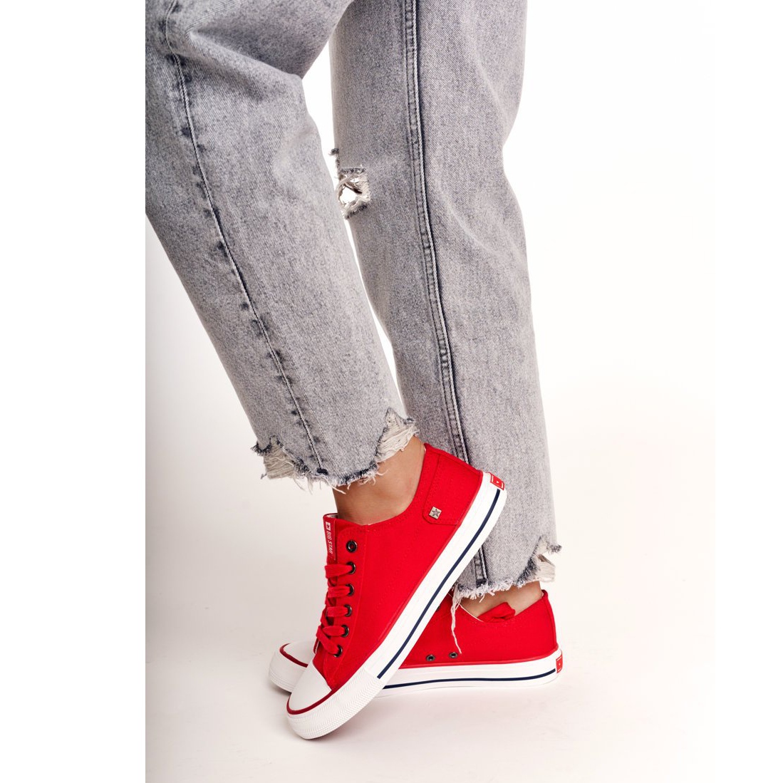 Klassische, niedrige große Star -Turnschuhe in einer intensiven, roten Farbe - ein zeitloses Modell im Stil der Oldschool, die sich auf die legendären Projekte aus den 70ern bezieht. Bequem, Spitzen -up und sehr universell - ideal für die Arbeit und für Wochenendausflüge oder Ausflüge aus der Stadt.