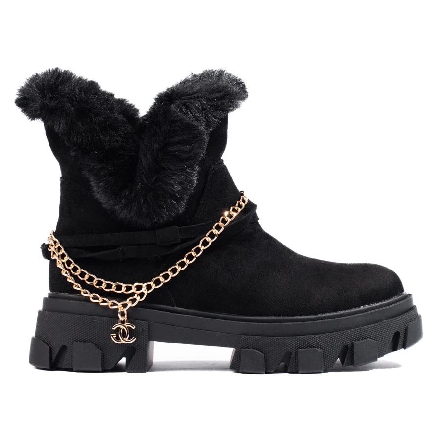 Elegante, komfortable und universelle - schwarze Frauenstiefel aus ökologischem Wildleder sind ein idealer Vorschlag für kühlere Tage. Die Kombination eines klassischen Schnitts mit modischen Details (dekorative Kette, spektakuläre Plattform) macht die Schuhe im Alltag im Alltag perfekt.