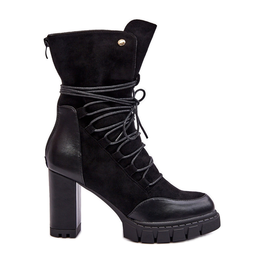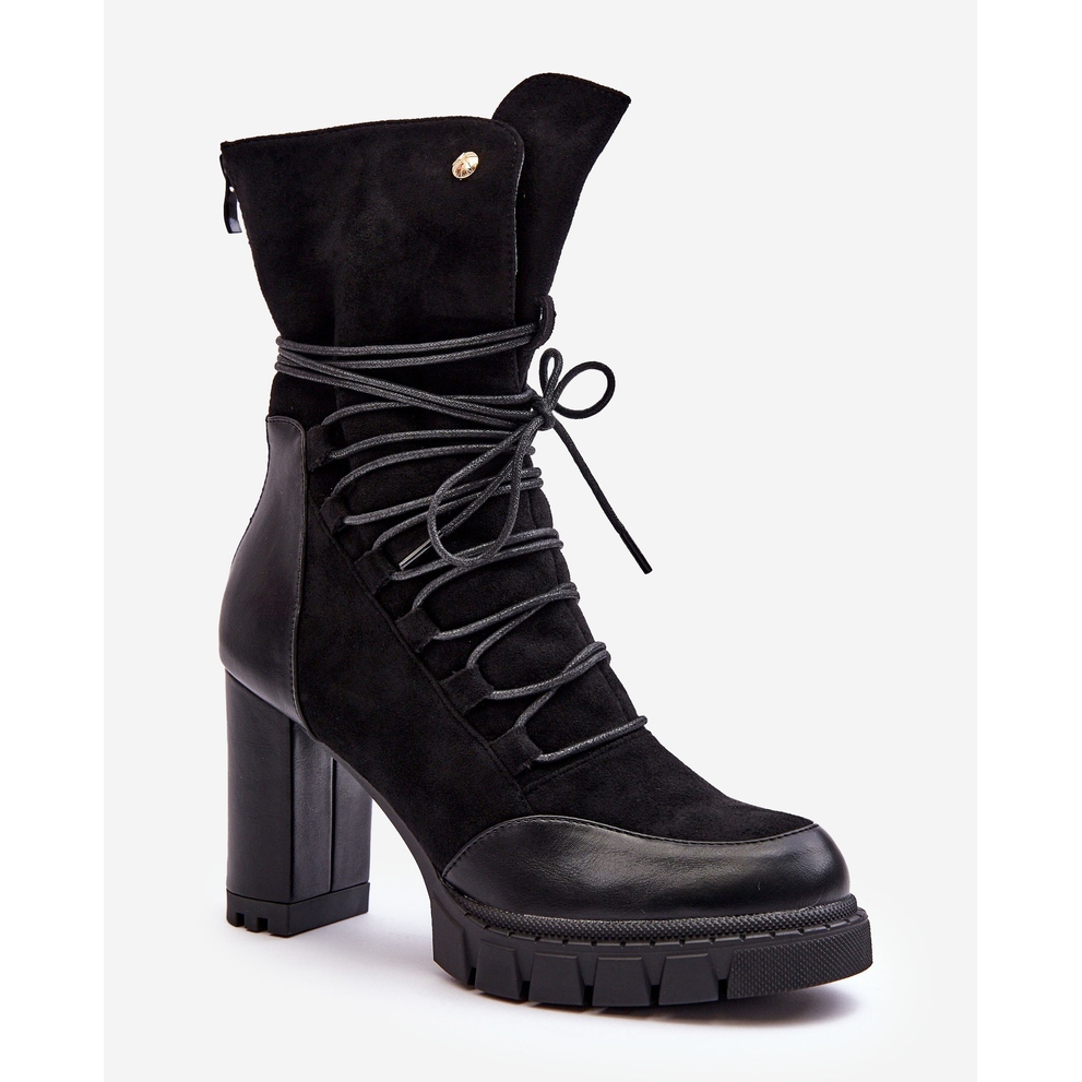 Frauenstiefel auf dem Posten mit Bindung - schwarz, stilvoll und komfortabel. Setzen Sie auf einer massiven Plattform und einem stabilen Pfosten (Fersenhöhe: 9,5 cm), ideal für die Herbst/Wintersaison. Sie bestehen aus ökologischem Leder und Öko -Wildleder mit Erwärmung in Form einer Schuhedecke - sie sorgen für Wärme und Komfort auch an kühleren Tagen. Auf der Rückseite des Obermessens befindet sich ein Schieberegler. Darüber hinaus können Sie auf der Vorderseite die Breite anpassen. Abgerundete Nasen, die für eine bessere Stabilität versteift wurden.