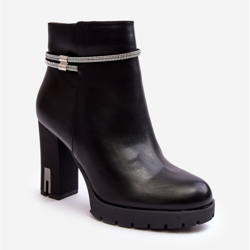 Elegante und komfortable Carolla -Stiefel in einer klassischen, schwarzen Version - ideal für Herbst- und Winterstilisierungen. Hergestellt aus ökologischem Leder, montiert auf einer stabilen Bar mit einer Plattform, die mit einem Gürtel mit kleinen, glänzenden Zirkonen für einen subtilen Glamour -Effekt verziert ist.