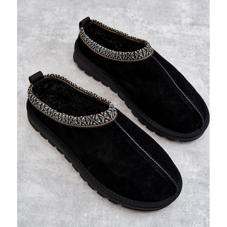 Warm, stilvoll und sehr komfortabel - perfekt für kalte Tage zu Hause. Hergestellt aus natürlichen Wildleder -Leder, isoliert mit einem weichen, dicken Fell, montiert auf einer massiven Plattform mit einer nicht linten Sohle. Klassische schwarze Farben und subtile Dekoration im Obermaterial lassen die Papiere elegant aussehen und sorgen gleichzeitig im Laufe des Tages.