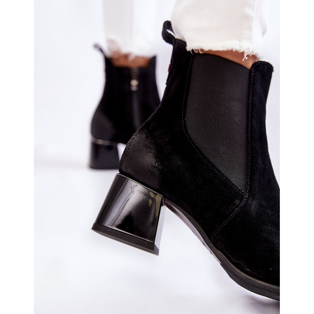 Elegante und praktische - Berit -Stiefel sind ein Vorschlag für Frauen, die den Komfort schätzen, ohne den Stil aufzugeben. Hergestellt aus natürlichen Wildlederleder in universeller Schwarz, eingebettet auf einer niedrigen, massiven Ferse wie einem Block (Höhe 5,5 cm). Eine klassische, abgerundete Nase und ein glattes Obermaterial ohne Muster machen das Modell leicht mit vielen Stilen - von lässigen Sets bis hin zu eleganteren Outfits bis zum Büro.